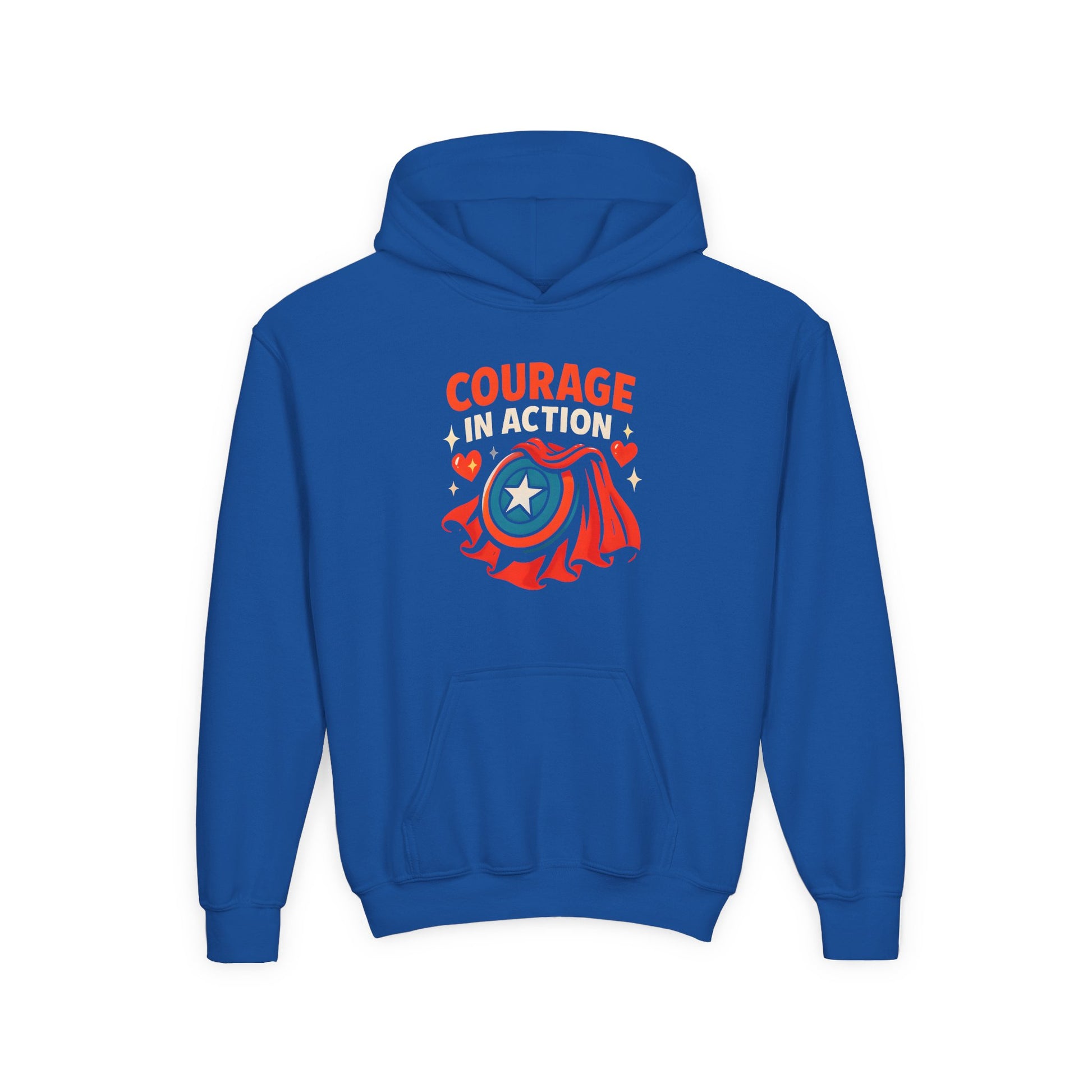 A cozy, kid-sized hoodie that carries a small but mighty message: Courage in Action. Soft yet durable midweight fabric keeps kids comfortable during school, playground battles, and family adventures. The bright, playful emblem—a star-shield and flowing cape—sits over the chest like a tiny badge of bravery, reminding the wearer to try, help, and stand up for others. Practical details like a roomy kangaroo pocket and a sewn-in label make it easy for caregivers and kids alike. Whether layered for crisp mornings or worn during chilly evenings, this hoodie becomes part of a child’s everyday toolkit for confidence and movement.
