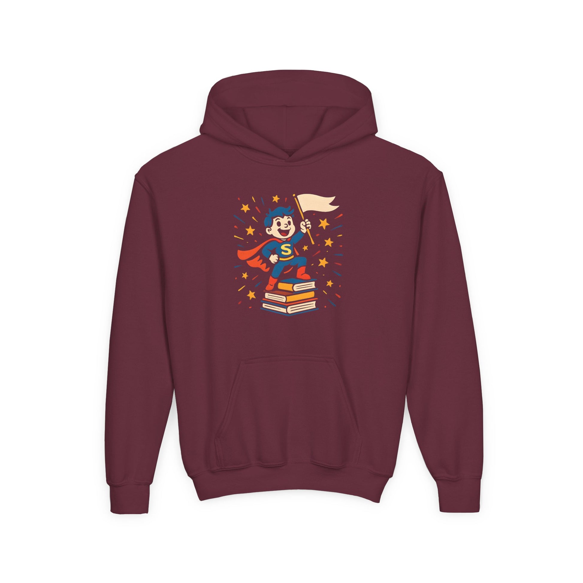 A cozy, kid-sized hoodie made for little readers who dream big. Soft, medium-weight fleece holds a bright, playful print of a caped child standing on a stack of books, surrounded by stars — a tiny hero celebrating curiosity and bedtime stories. Wear it to library days, school events, or quiet evenings at home; it wraps a child in warmth and imagination.