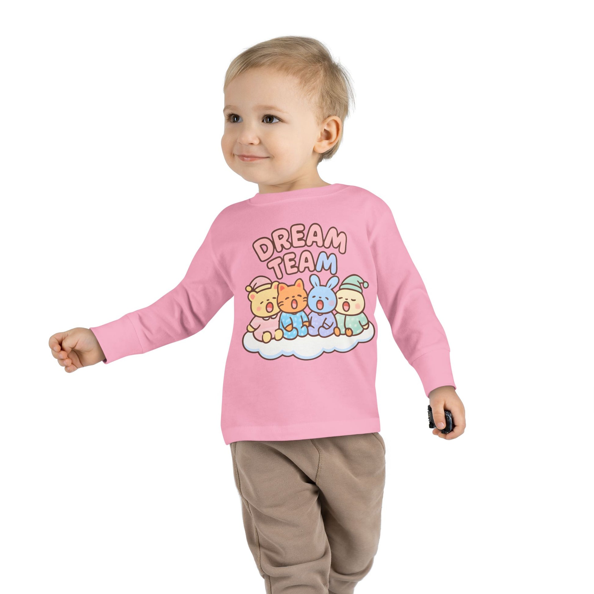 Soft, light, and utterly sweet — this long-sleeve toddler tee brings sleepy-time charm to everyday play. Four pastel pals sit on a fluffy cloud under a cheerful “DREAM TEAM” banner, their rounded shapes and gentle colors comforting on chilly mornings and cozy afternoons. The relaxed toddler fit and ribbed cuffs keep tiny arms warm without restricting movement. Breathable, combed-ring spun cotton (with blended options in heather tones) feels gentle against sensitive skin. This is the kind of shirt that sparks quiet smiles at nap time, pairs effortlessly with leggings or overalls, and becomes a familiar favorite for story hour and slow weekends at home.