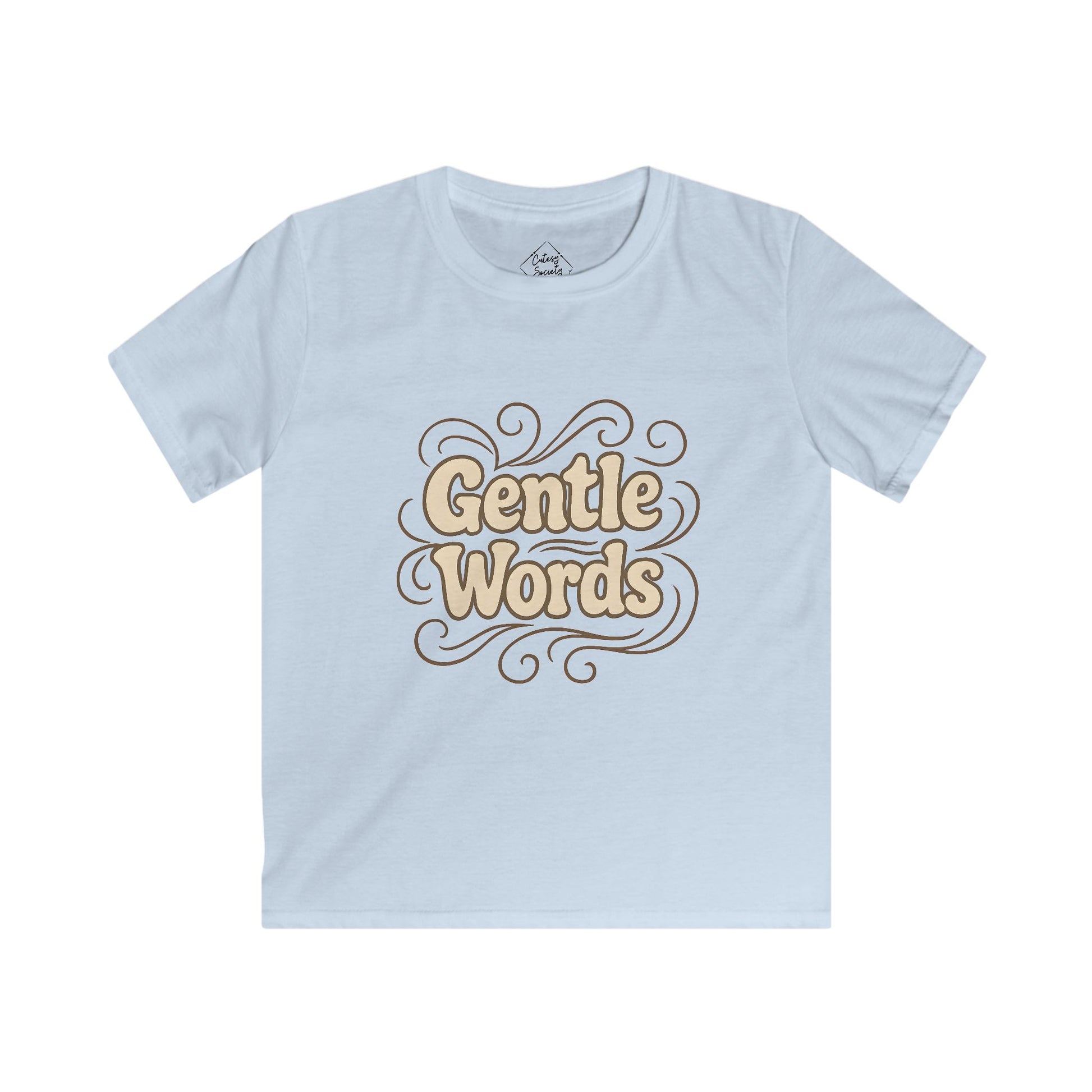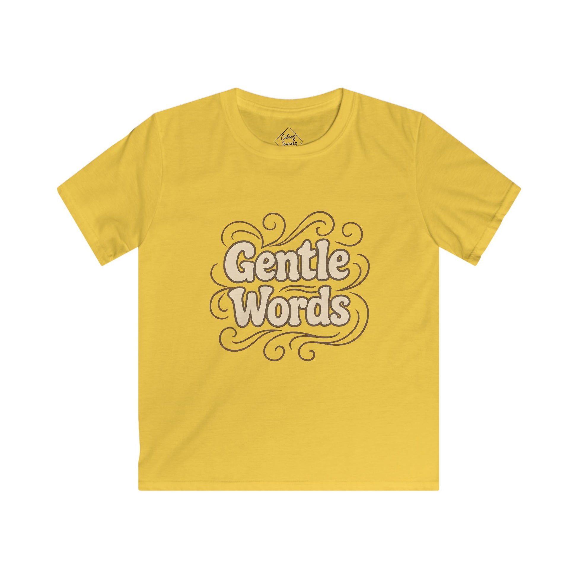 Soft and calm, this design highlights the phrase "Gentle Words" with a playful, retro script. This is a kids' soft cotton t-shirt designed for everyday wear. It feels warm and reassuring.