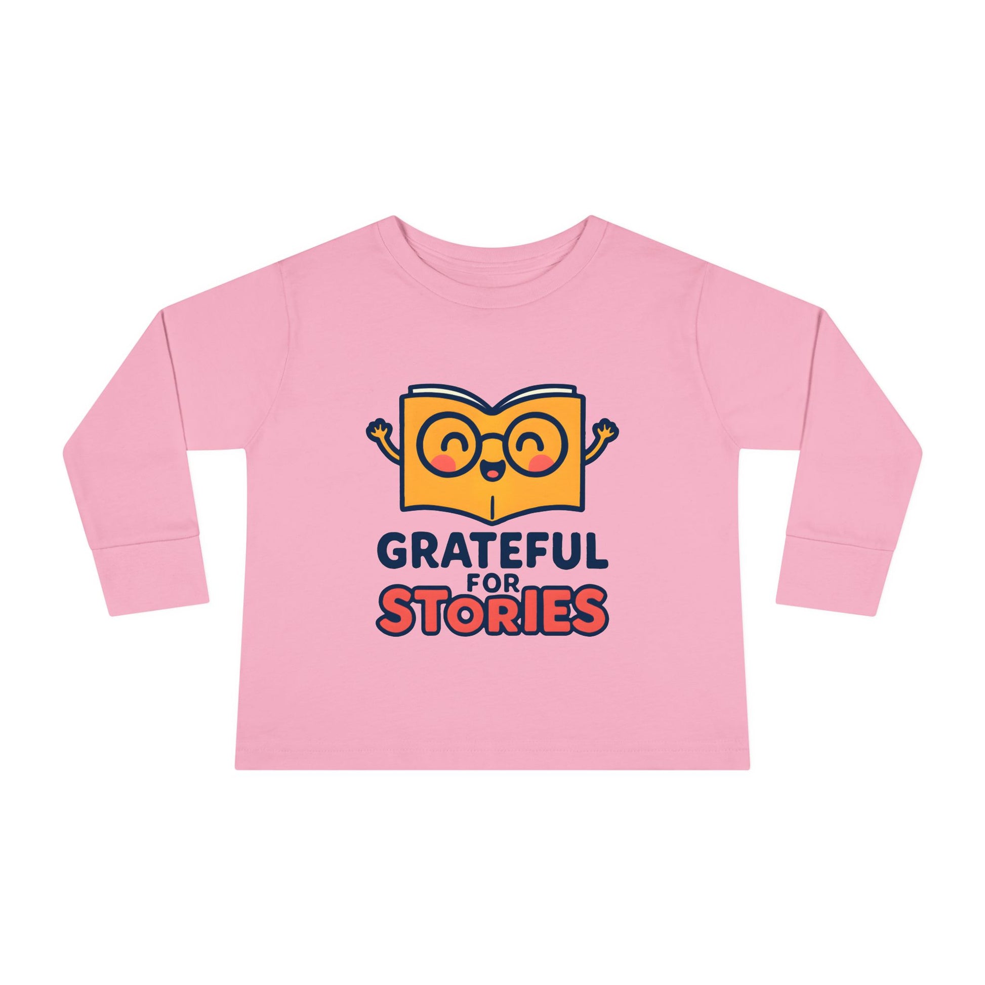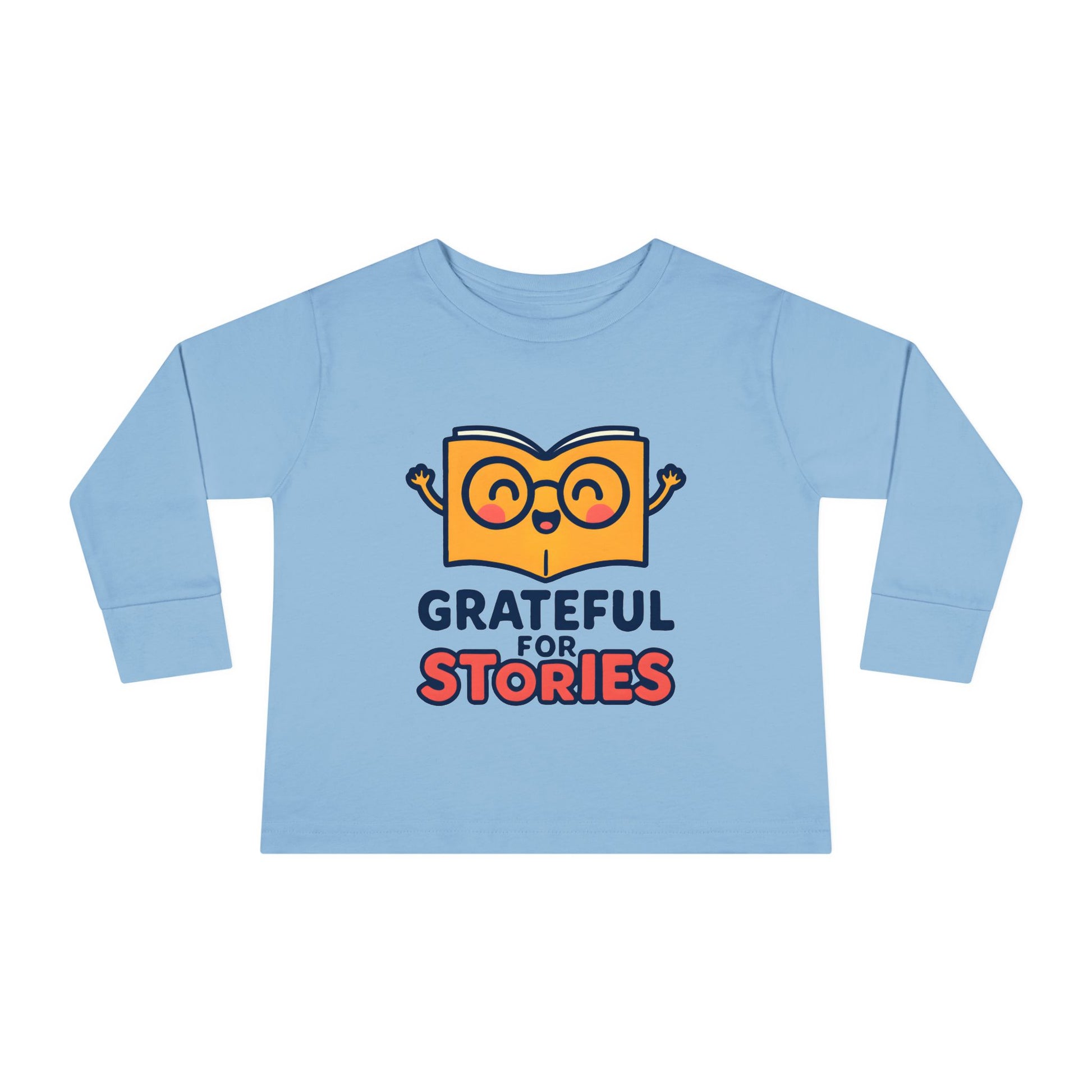 Soft and simple long-sleeve tee designed for little ones who live for storytime. A cheerful, illustrated book with smiling glasses and the words “Grateful for Stories” sits on a light canvas, inviting cozy laps and quiet page-turning moments. The lightweight knit drapes gently on toddlers, with ribbed cuffs and collar that keep sleeves and neckline neat after wash-and-play days. Breathable cotton and thoughtful construction—side seams, neck and shoulder tape, and a tear-away label—make it easy to wear from morning reading circles to sleepy bed-time rituals.