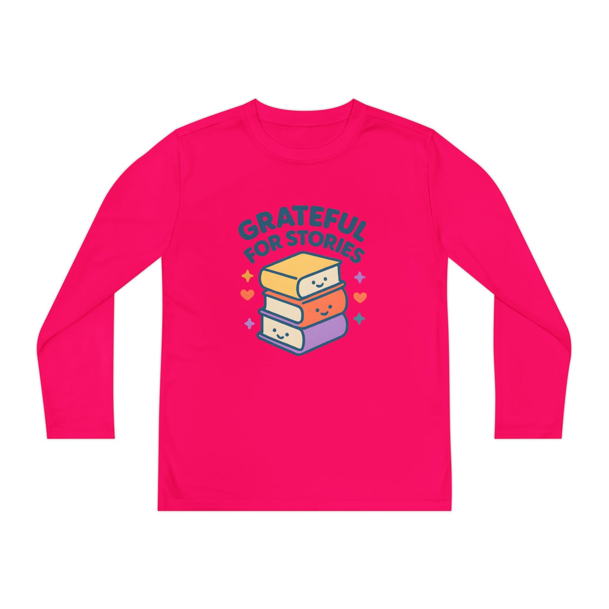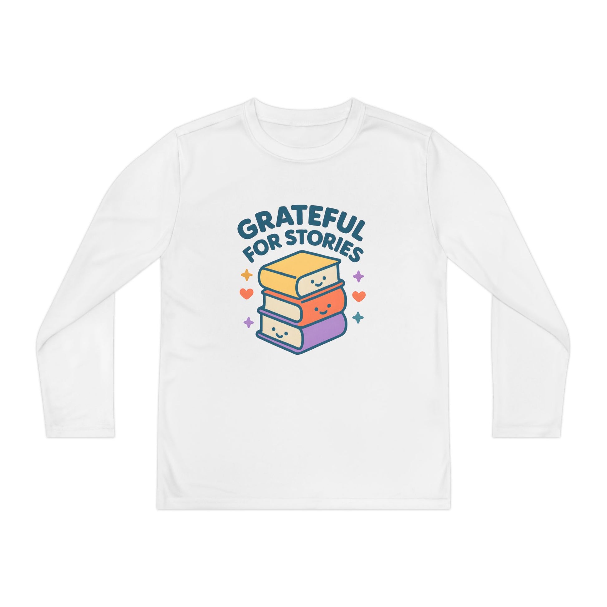 Lightweight and lively, this long-sleeve tee celebrates a love of stories with a cheerful stack of smiling books and the phrase “Grateful for Stories.” Breathable, moisture-wicking polyester keeps active kids cool during reading time, recess, and after-school adventures. The athletic cut and extra-light fabric move with curious bodies without weighing them down. Bright DTF printing preserves crisp colors and playful details wash after wash. Wear it to library days, book club meetups, classroom activities, or quiet afternoons on the porch — it brings a little joy and literary pride to everyday moments.