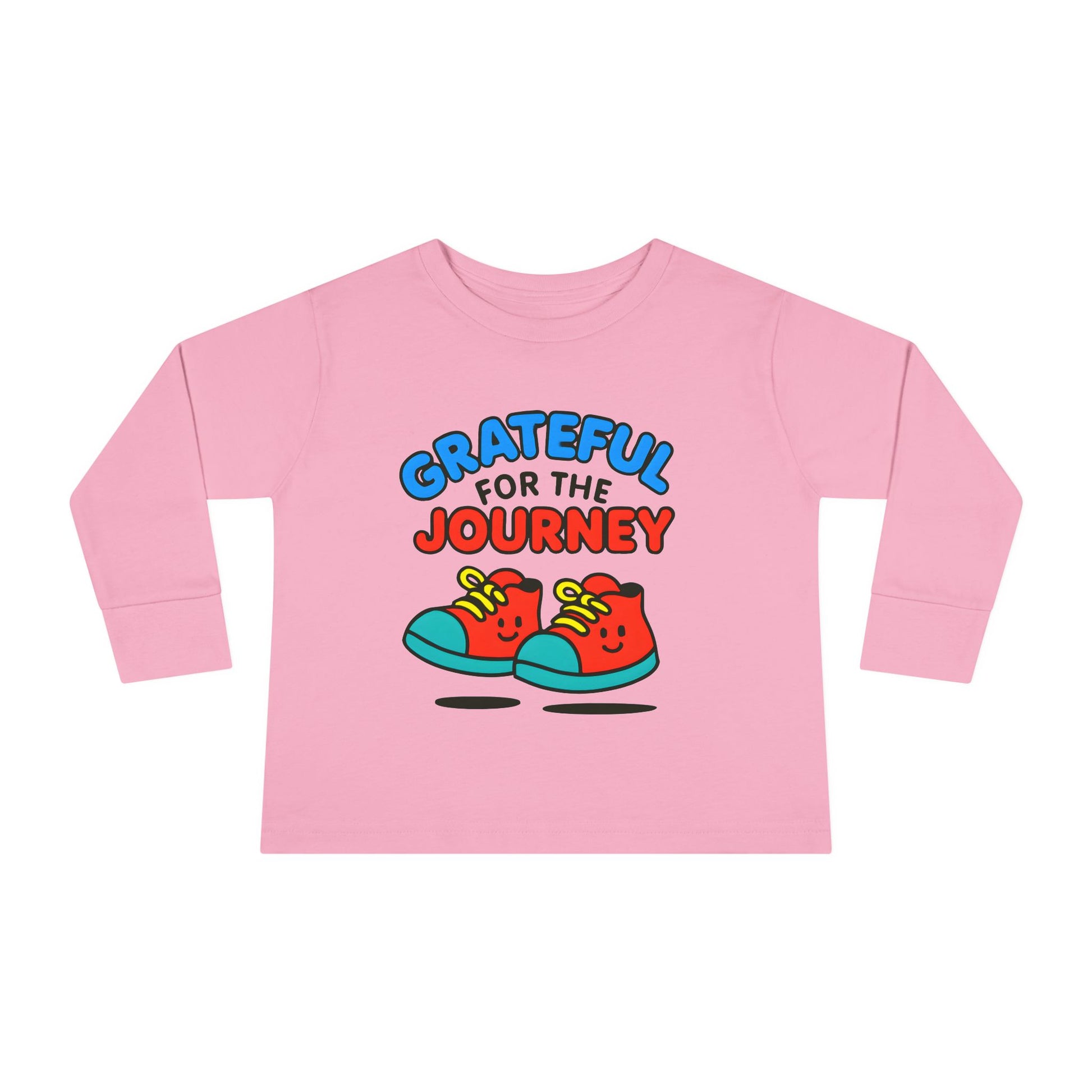 Soft, playful, and made for tiny explorers — this long sleeve toddler tee celebrates every small step. Bright, cartoon sneakers and the cheerful phrase “Grateful for the Journey” sit front-and-center on a gentle heather gray canvas. Lightweight and breathable, the shirt moves easily with their playtime—whether it’s a morning at the park, a cozy storytime, or a stroller stroll through town. The ribbed collar and cuffs hold their shape through washes, and the side seams keep a tidy silhouette so the design stays bold and fun. It’s a comfy layer that nods to curiosity, resilience, and the little victories parents and kids share every day.