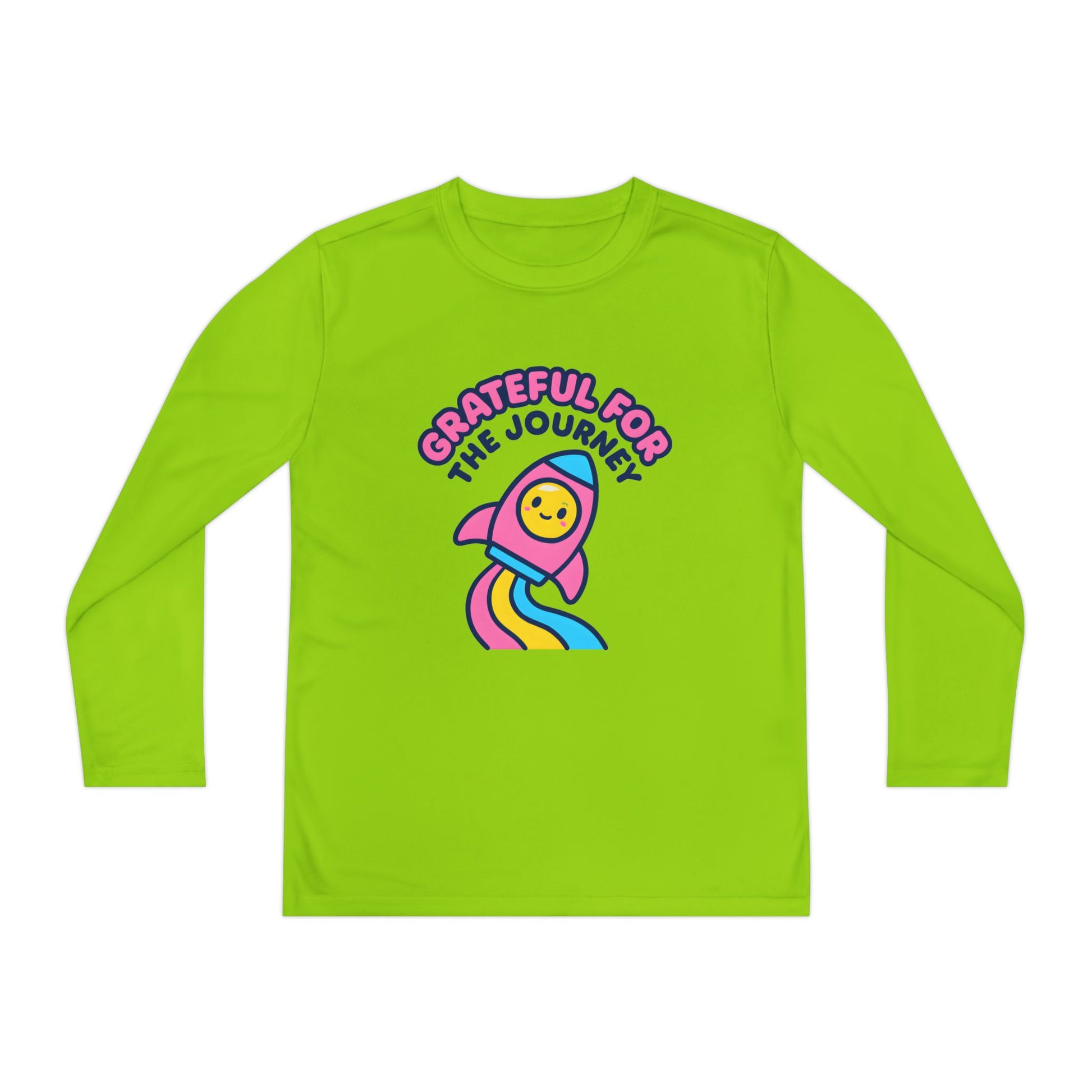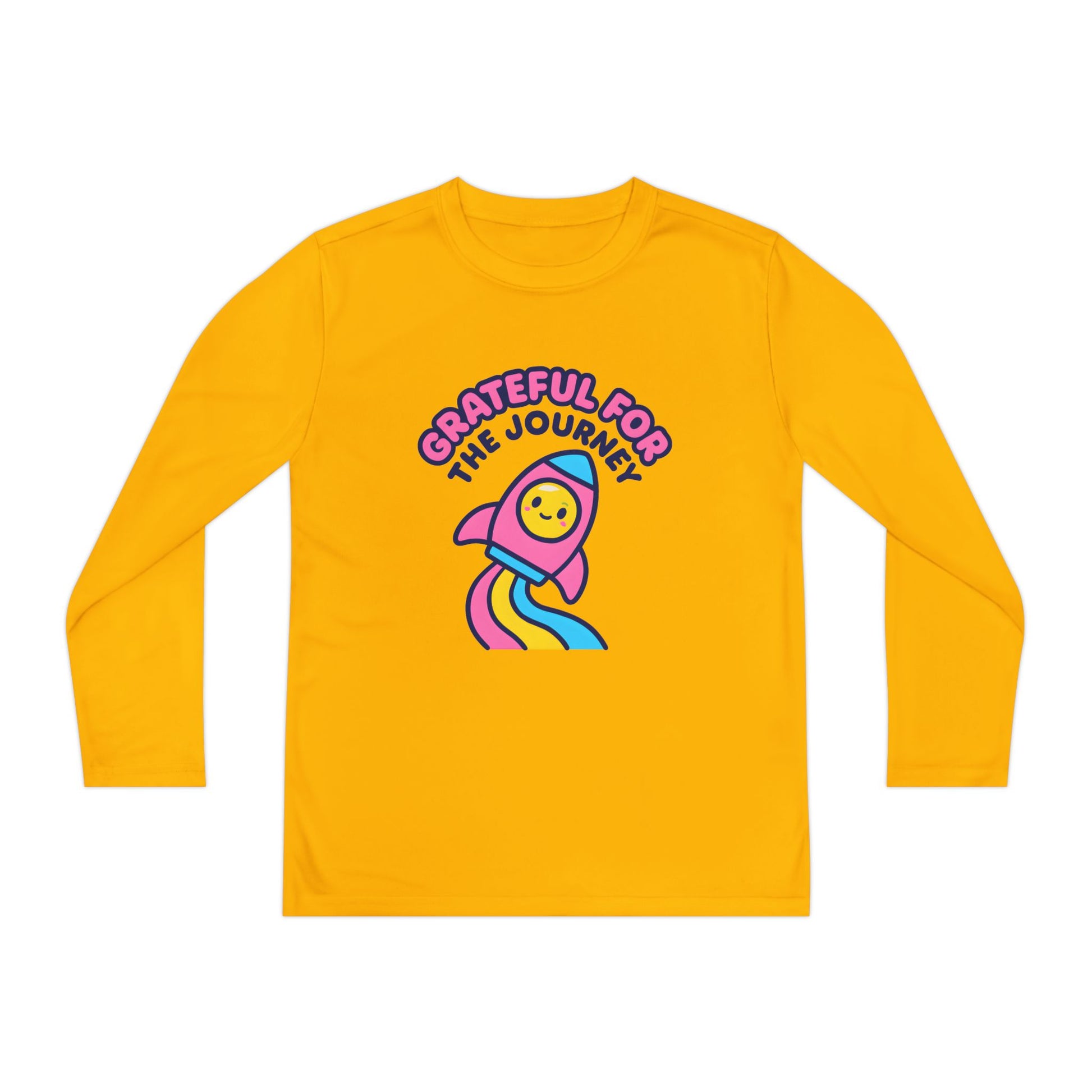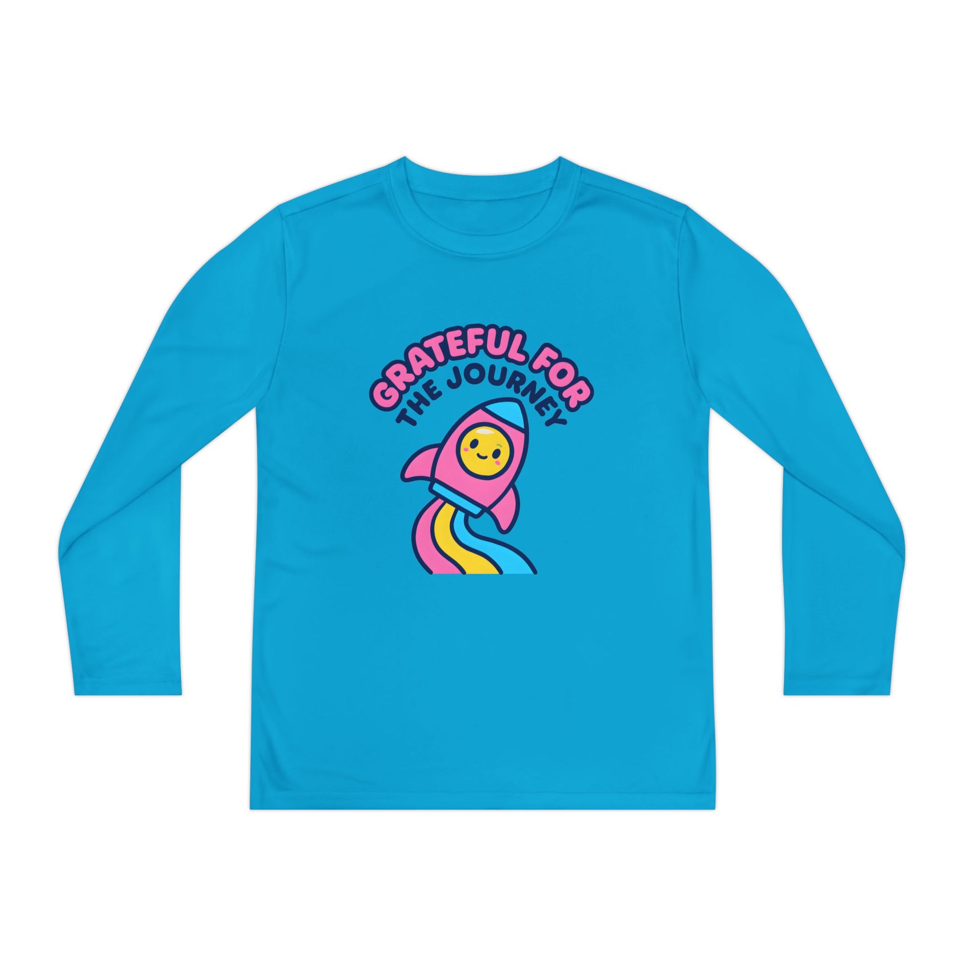 This lightweight long sleeve brings bright, upbeat energy to active kids. Made from extra-light, moisture-wicking polyester, it moves with them through practices, playdates, and warm-weather training while keeping skin dry and comfortable. The cheerful, colorful graphic—featuring a smiling character and the message “Grateful for the Journey”—adds a playful, encouraging vibe that’s right at home on the field, at summer camps, or during casual outings. Athletic cut and tear-away label ensure a snag-free, performance-ready fit that layers easily under jerseys or windbreakers.