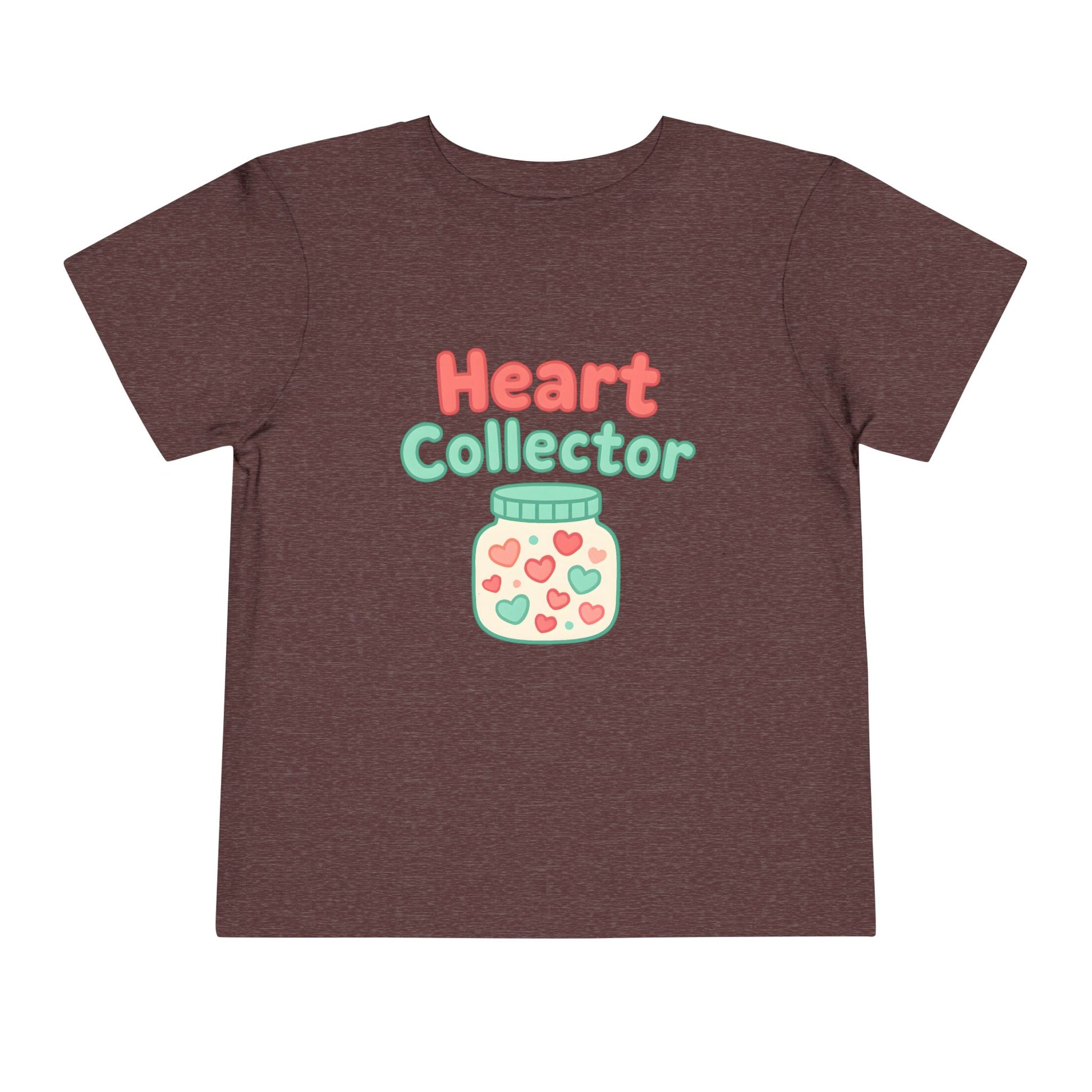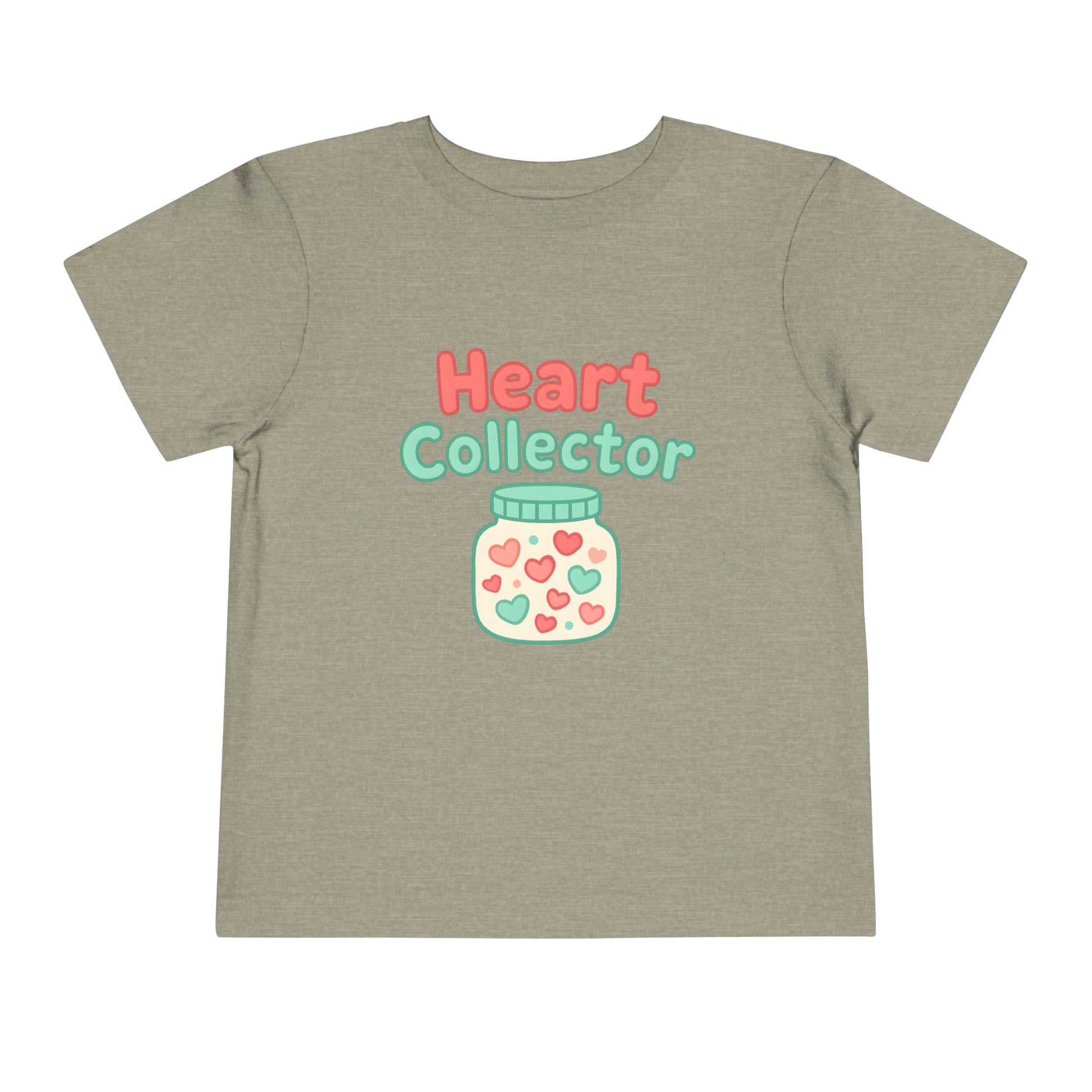 A jar of little hearts sits under the words Heart Collector in soft, friendly colors. This is a lightweight toddler t-shirt designed for everyday wear. It feels gentle, caring, and full of small joys.