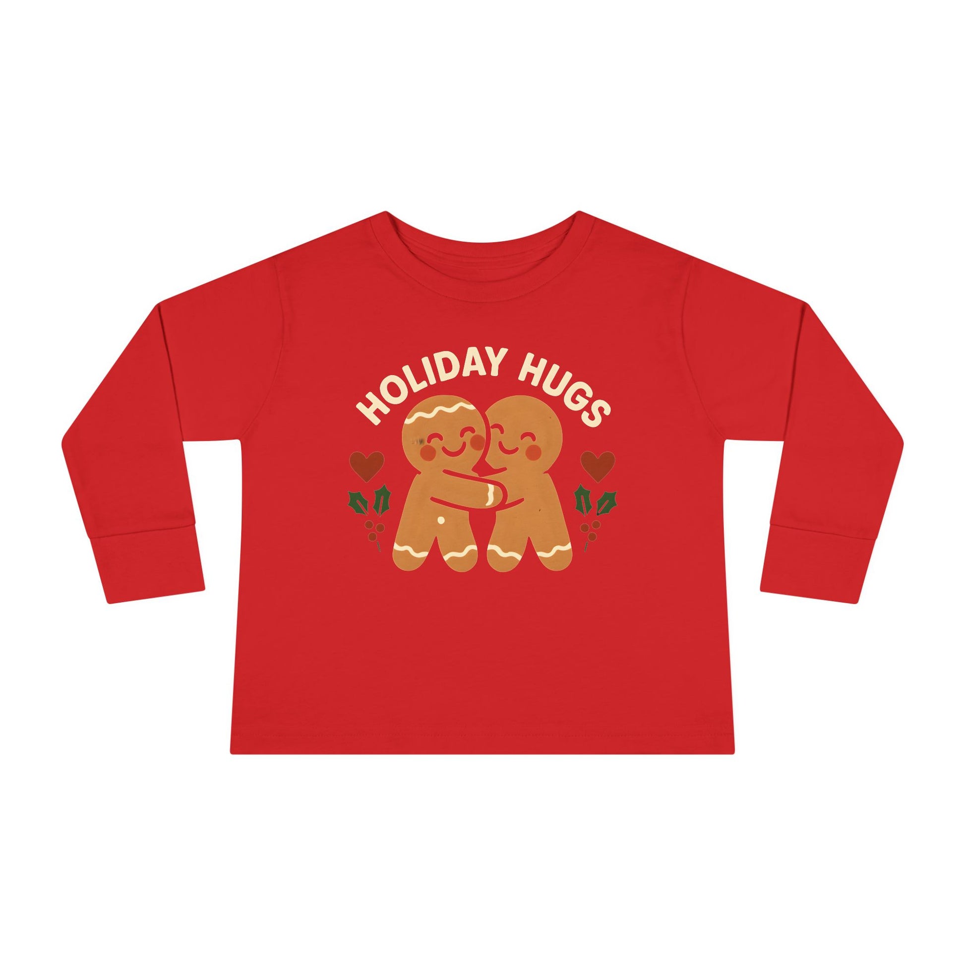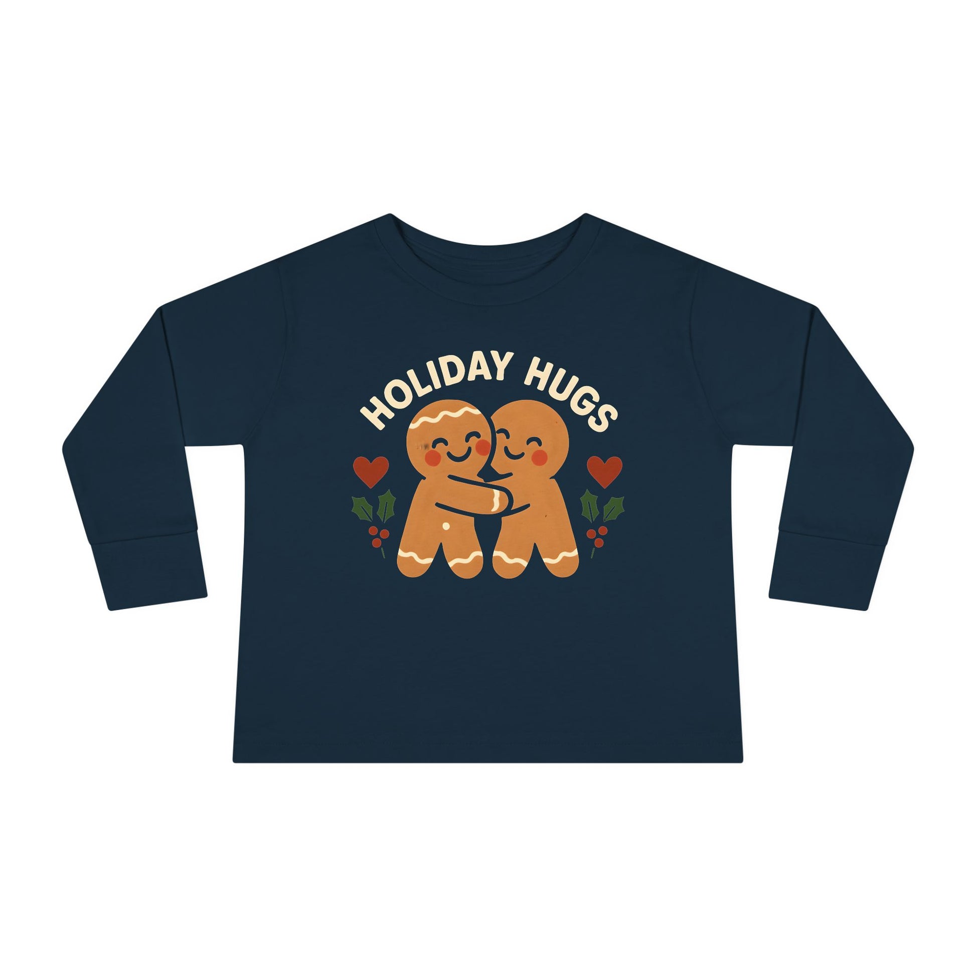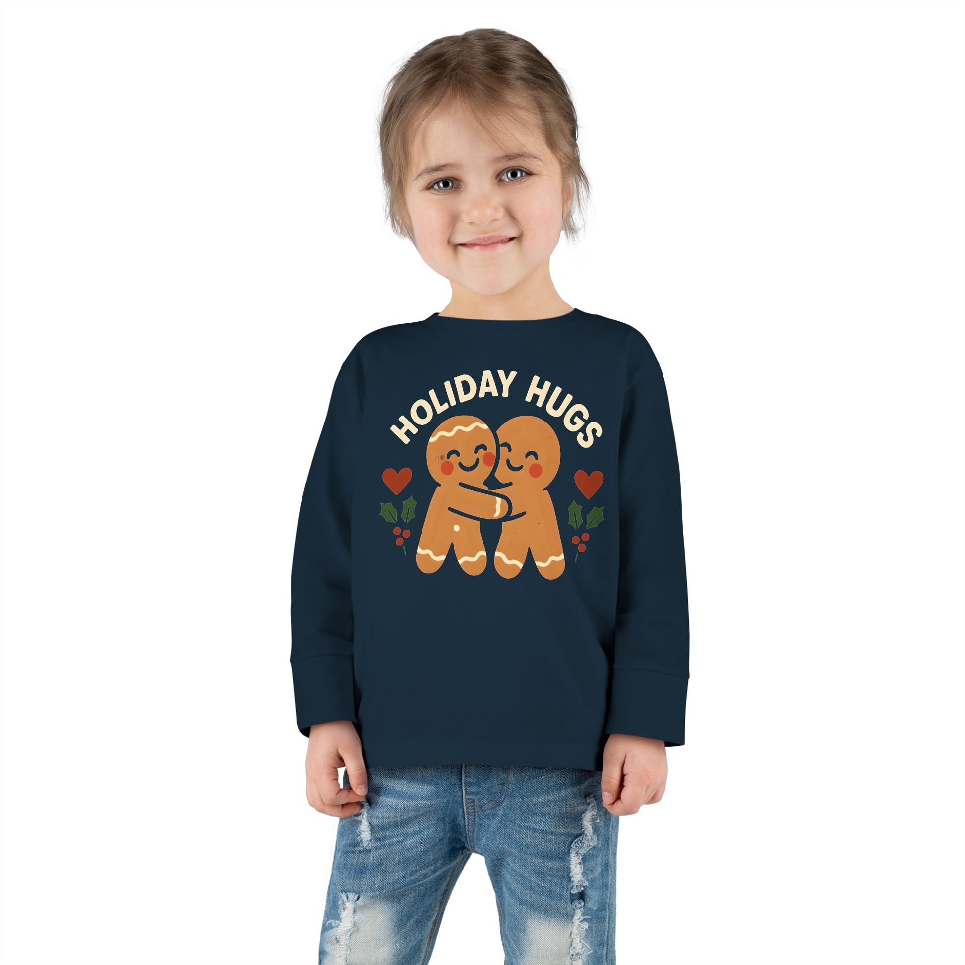 Soft and sweet, this toddler long sleeve tee brings cozy holiday cheer to little ones. Two smiling gingerbread friends embrace beneath the words “Holiday Hugs,” framed by tiny hearts and sprigs of holly. The lightweight cotton feels gentle on delicate skin while ribbed collar and cuffs keep the neckline and sleeves neat through play, naps, and family photos. Easy to layer under a jacket or over pajamas, it slides on with a tear-away label for scratch-free comfort. It’s the kind of shirt that turns everyday wear into a small celebration — warm, simple, and full of charm.