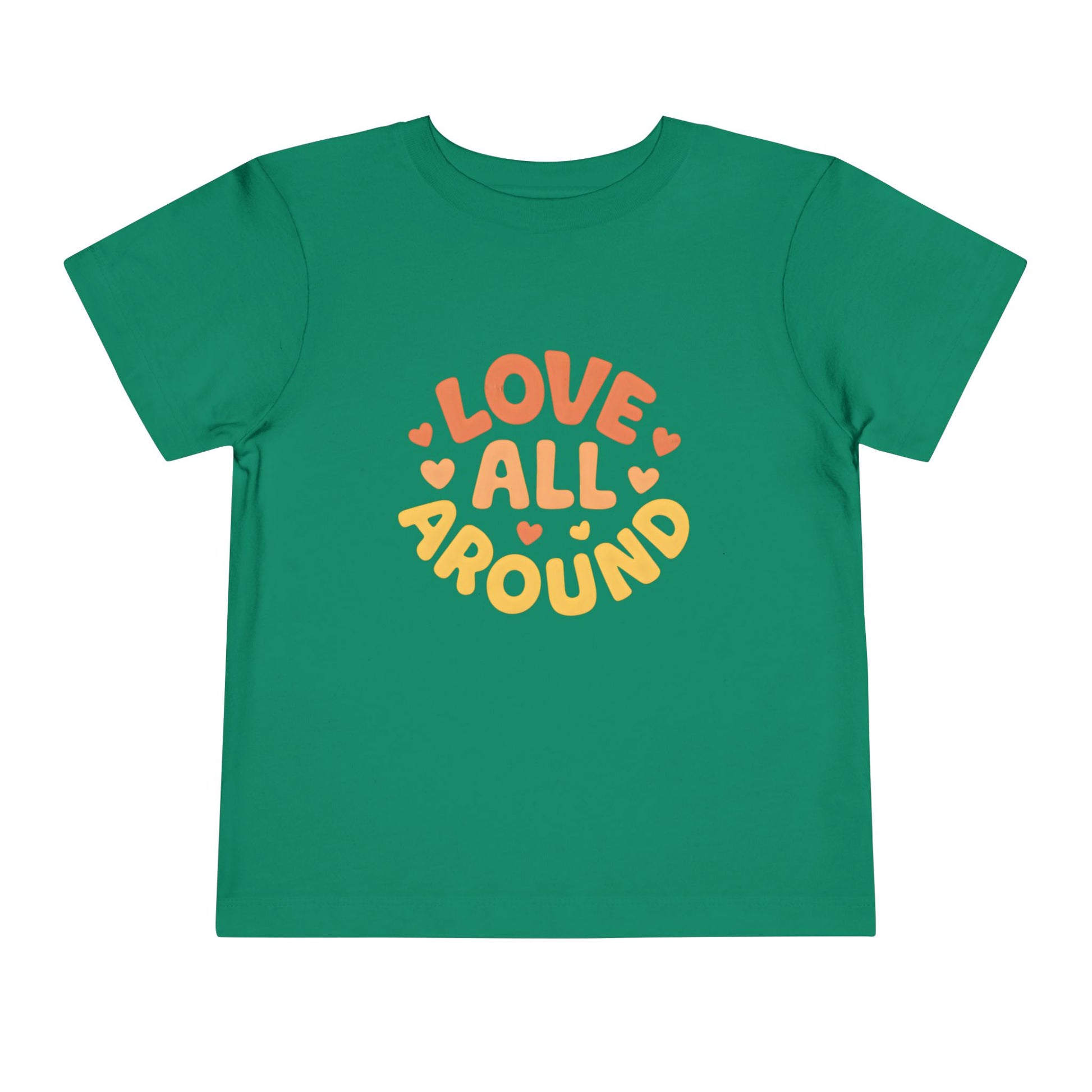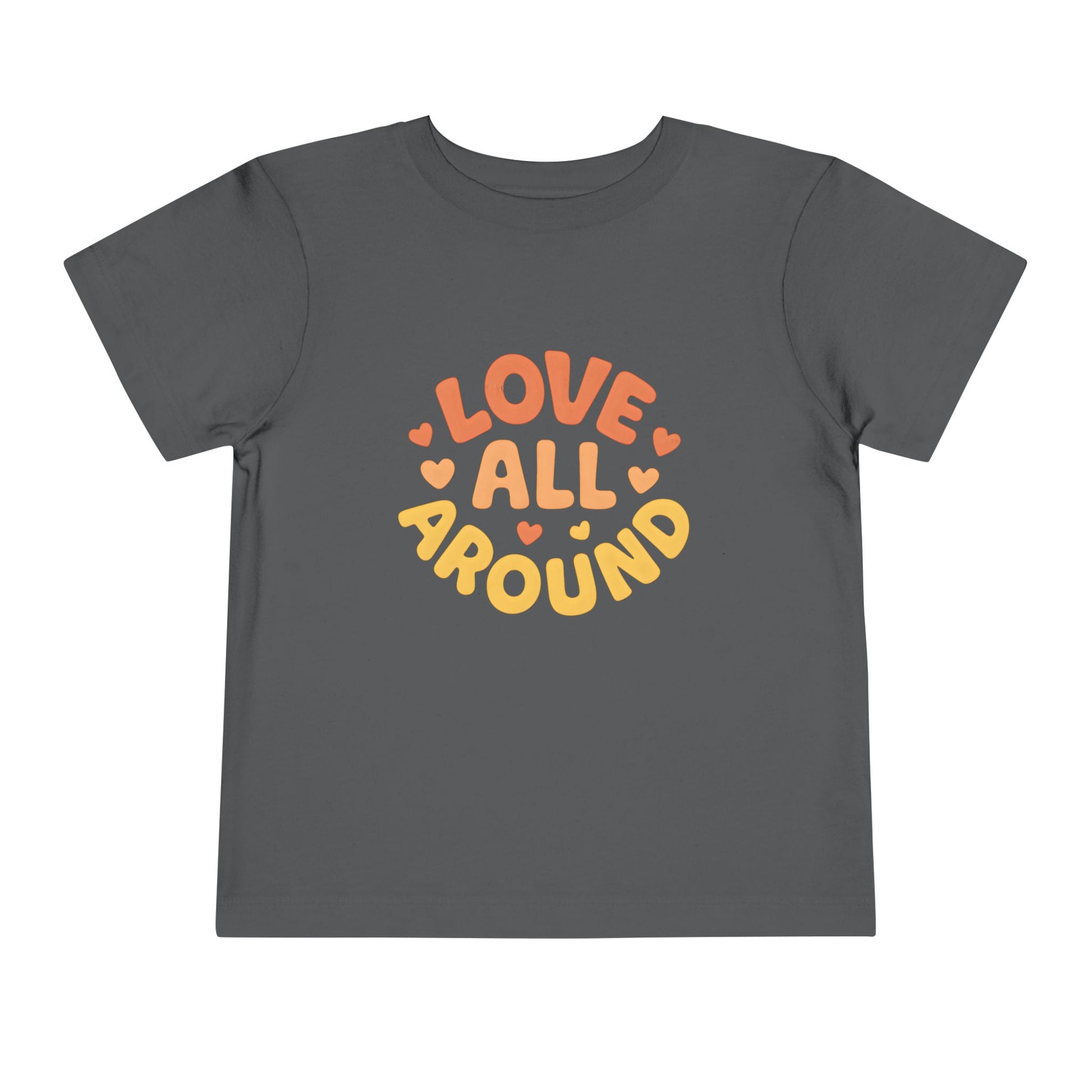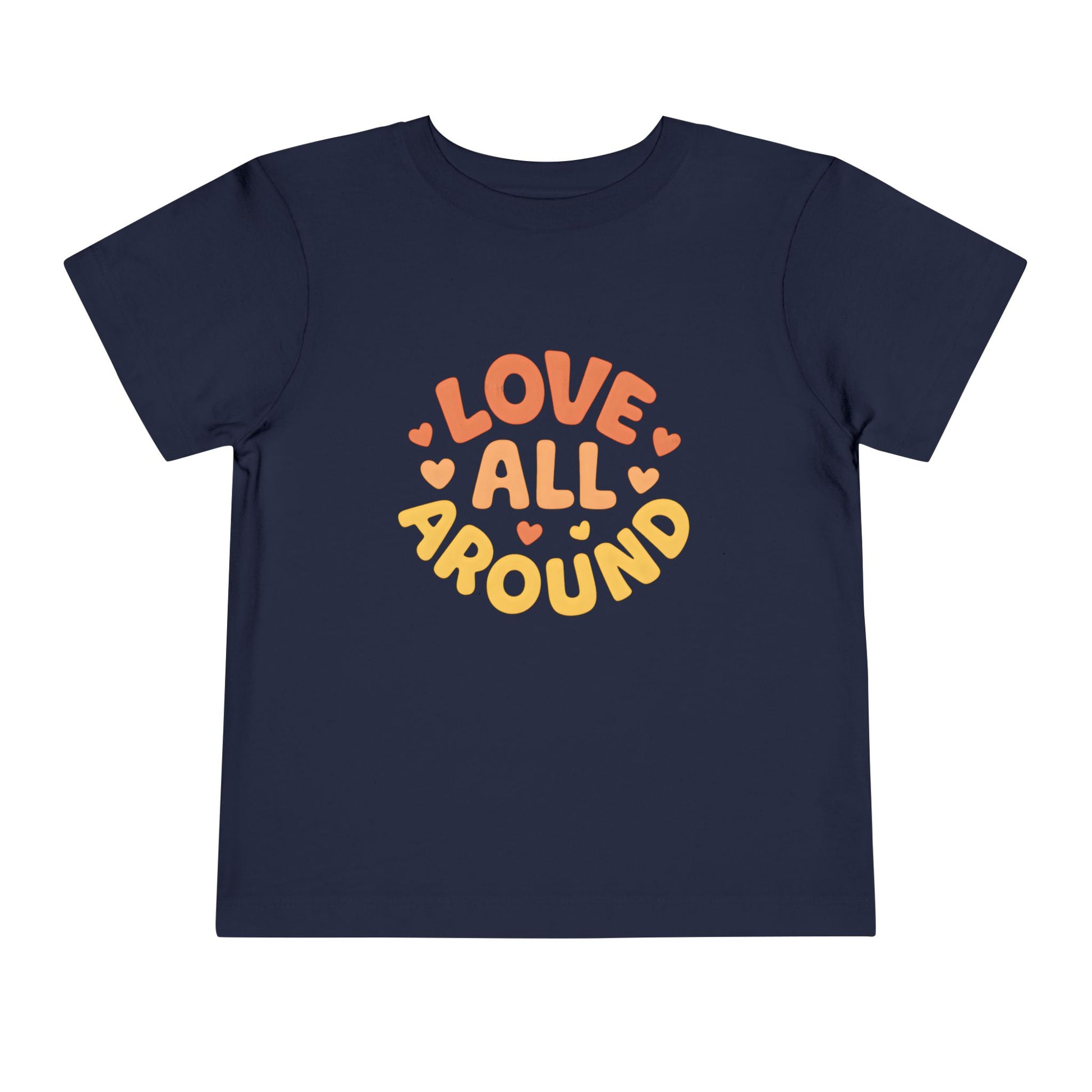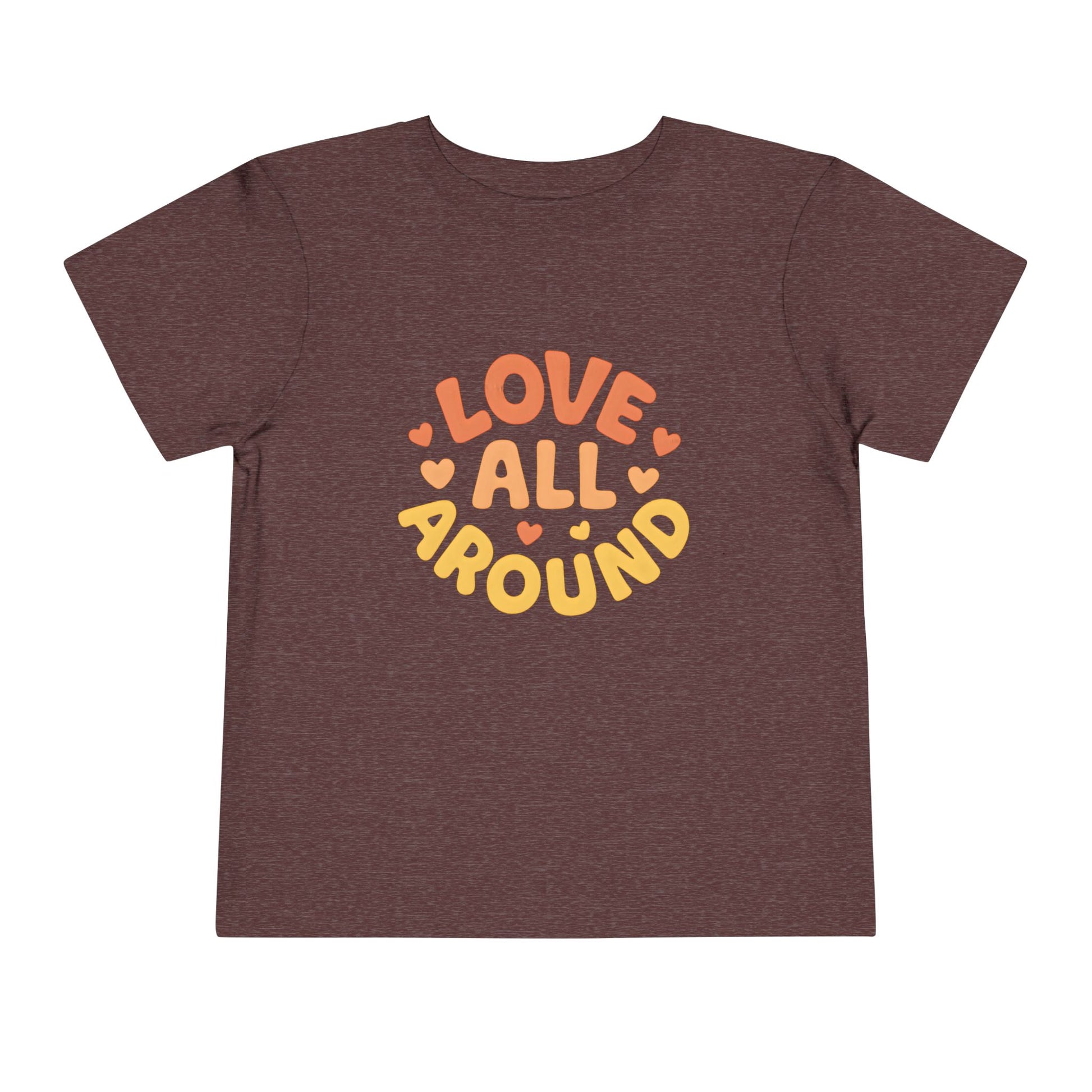Rounded lettering and tiny hearts say Love All Around in warm, affectionate colors. This is a lightweight toddler t-shirt designed for everyday wear. It feels sweet, simple, and easy to style.