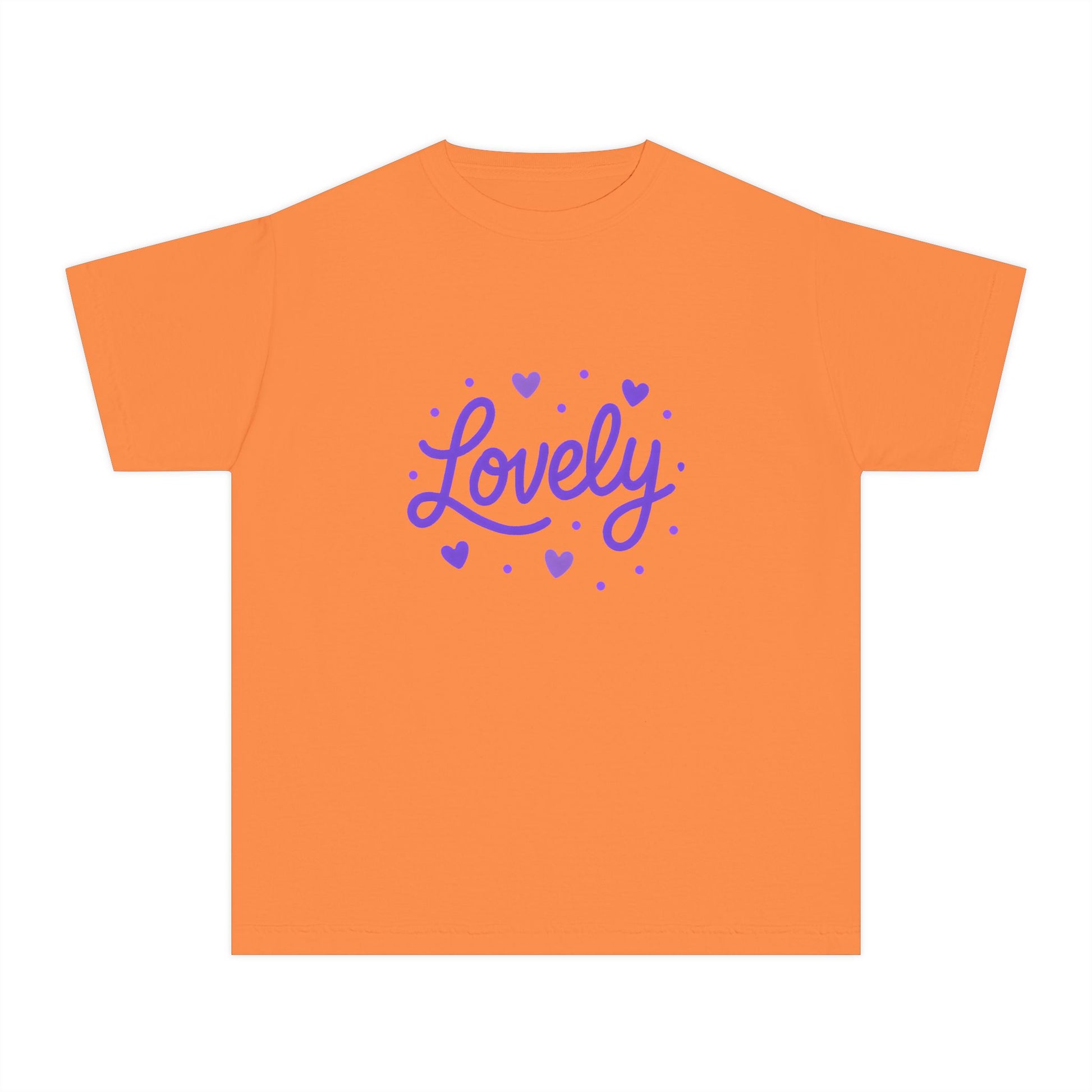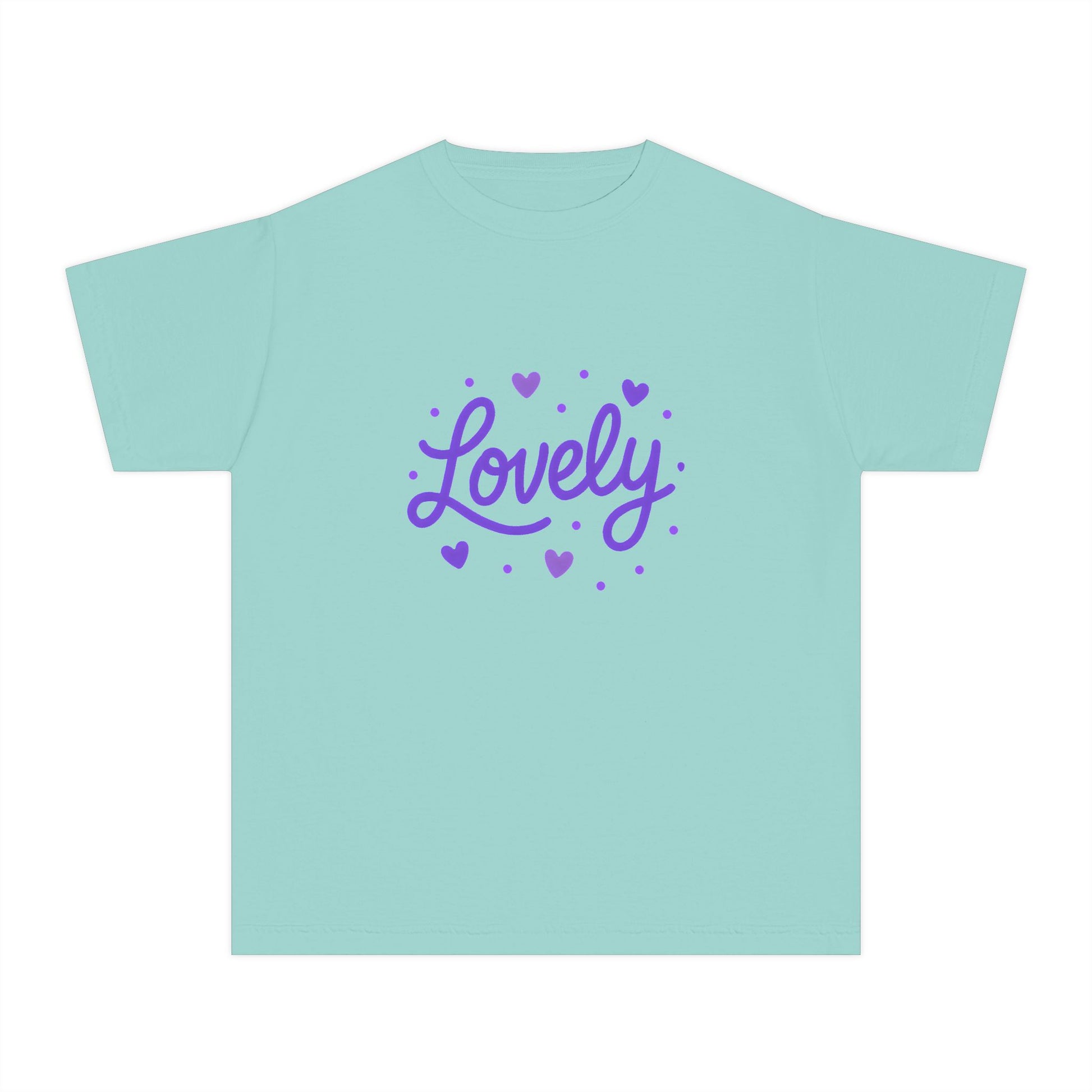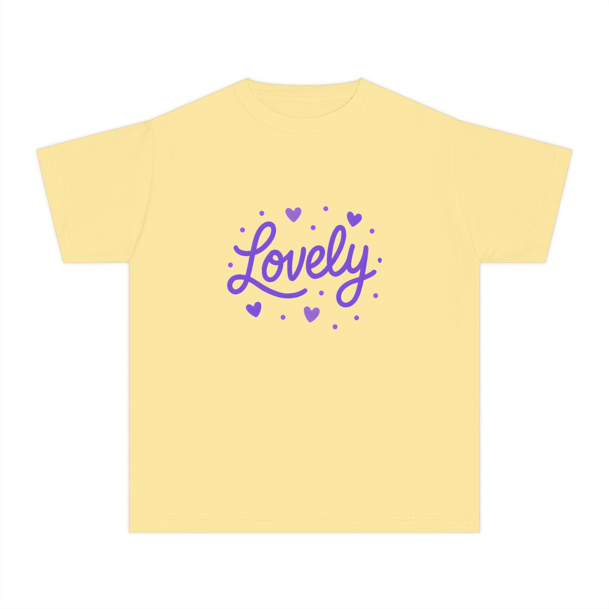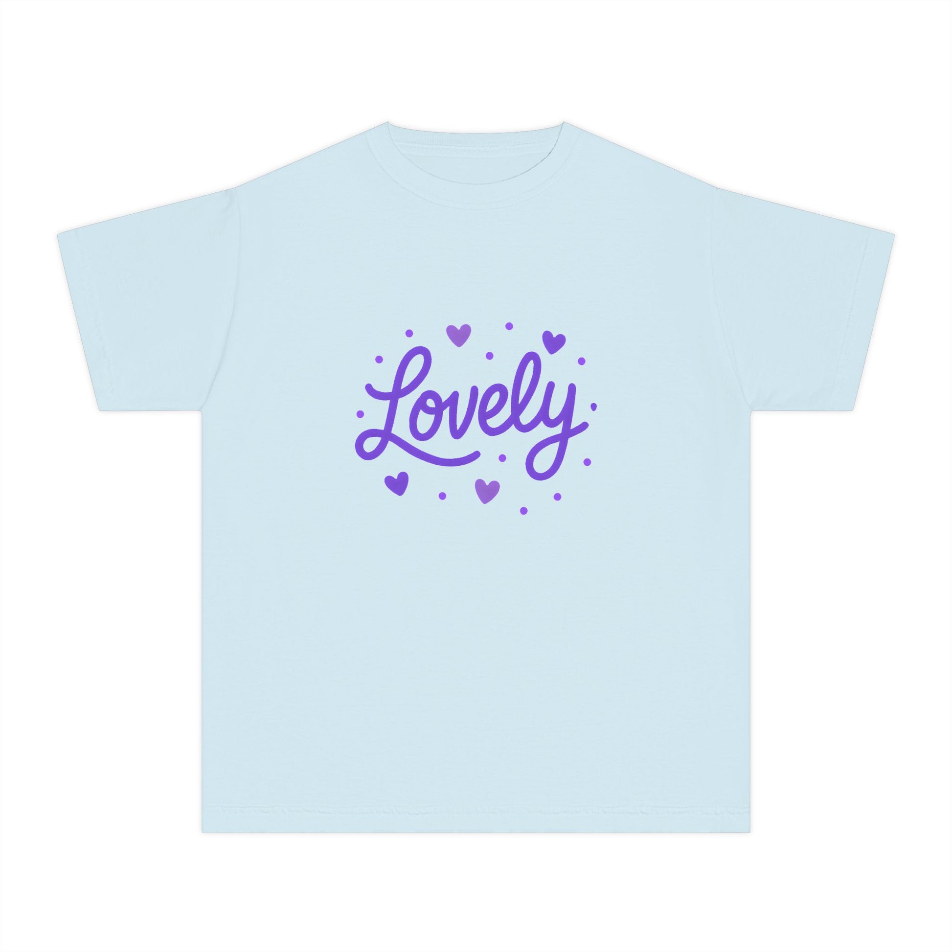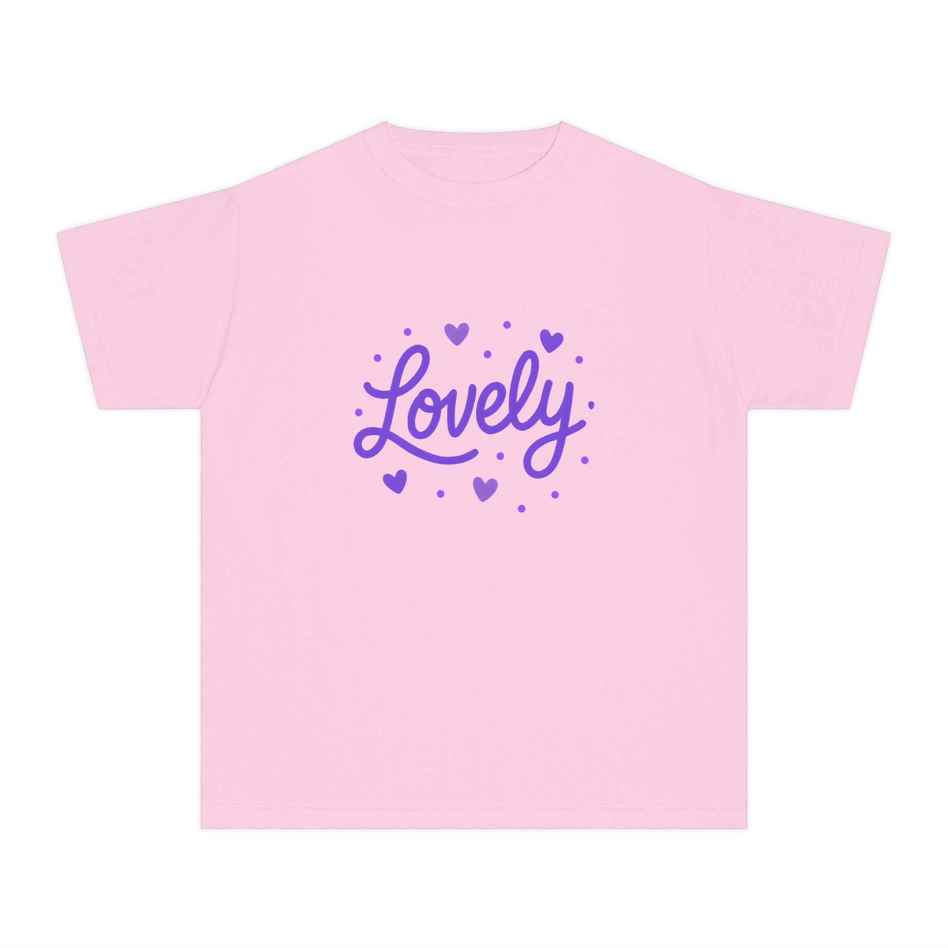 Soft, sweet, and quietly joyful, this design keeps the word "Lovely" front and center with tiny hearts. This is a kids' relaxed fit t-shirt designed for easy everyday wear. The gentle purple lettering feels calm and warm.
