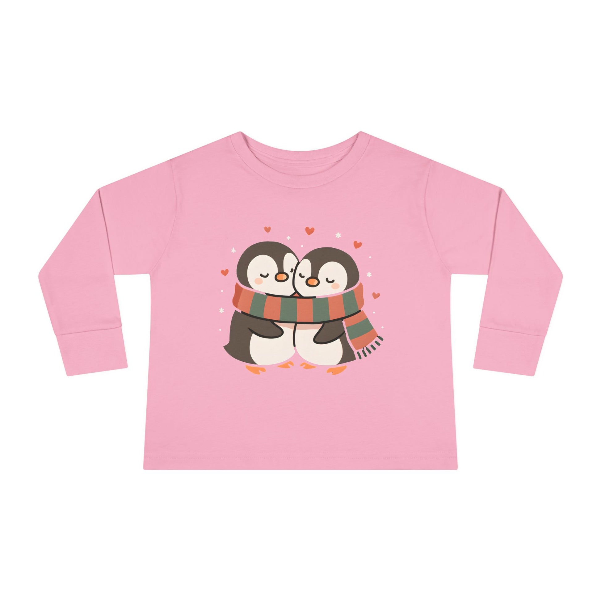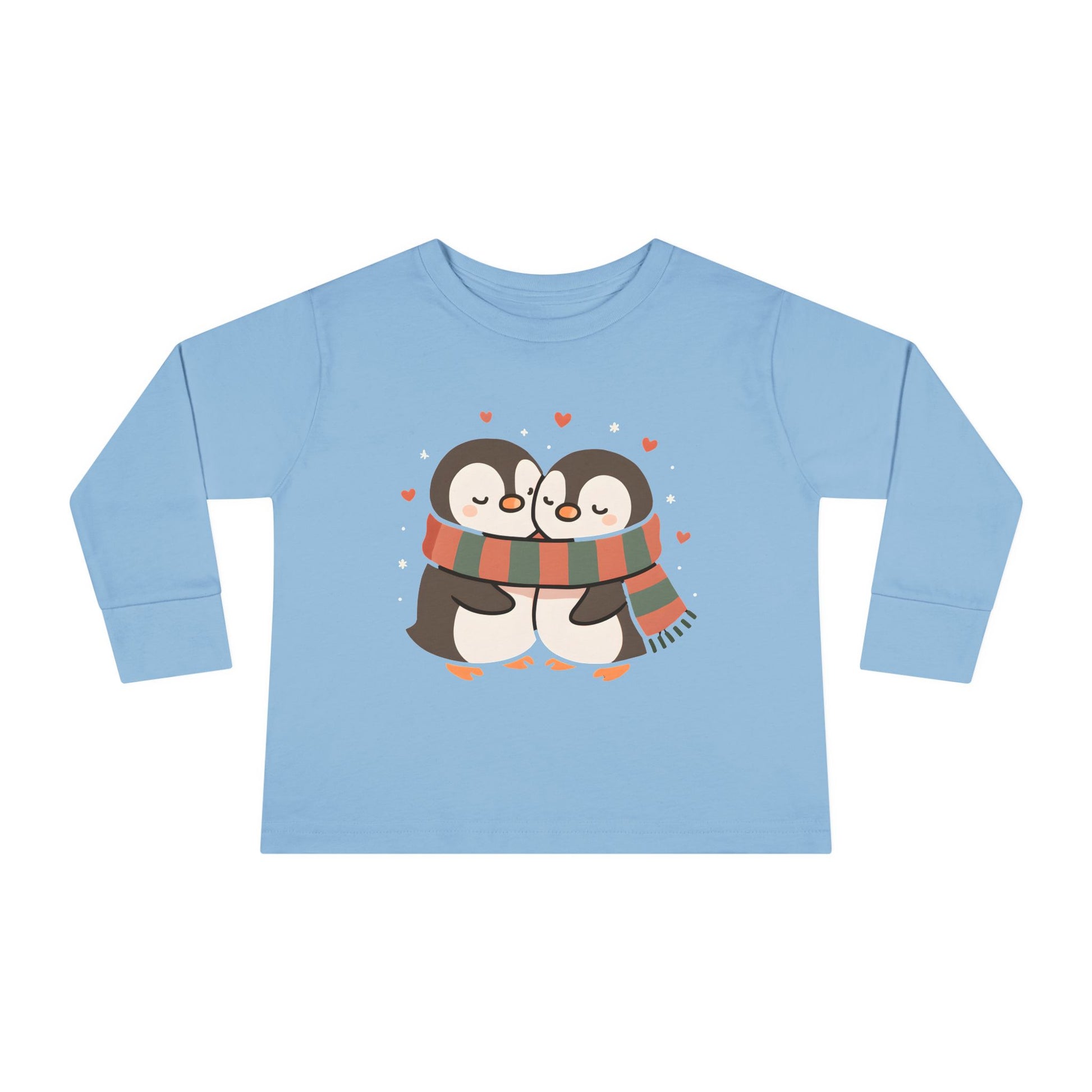 A soft, light-weight long sleeve tee made for little ones who love cozy moments. Gentle blue fabric cradles an adorable illustration of two penguins sharing a striped scarf — tiny hearts and soft lines give it a warm, snuggly feeling. The ribbed collar and cuffs hold their shape through play and wash, while side seams and neck tape keep the shirt fitting comfortably on busy toddlers. Breathable combed cotton lets them move freely during storytime, park runs, or quiet naps. The simple back keeps the focus on the sweet front design that sparks smiles and quiet hugs.