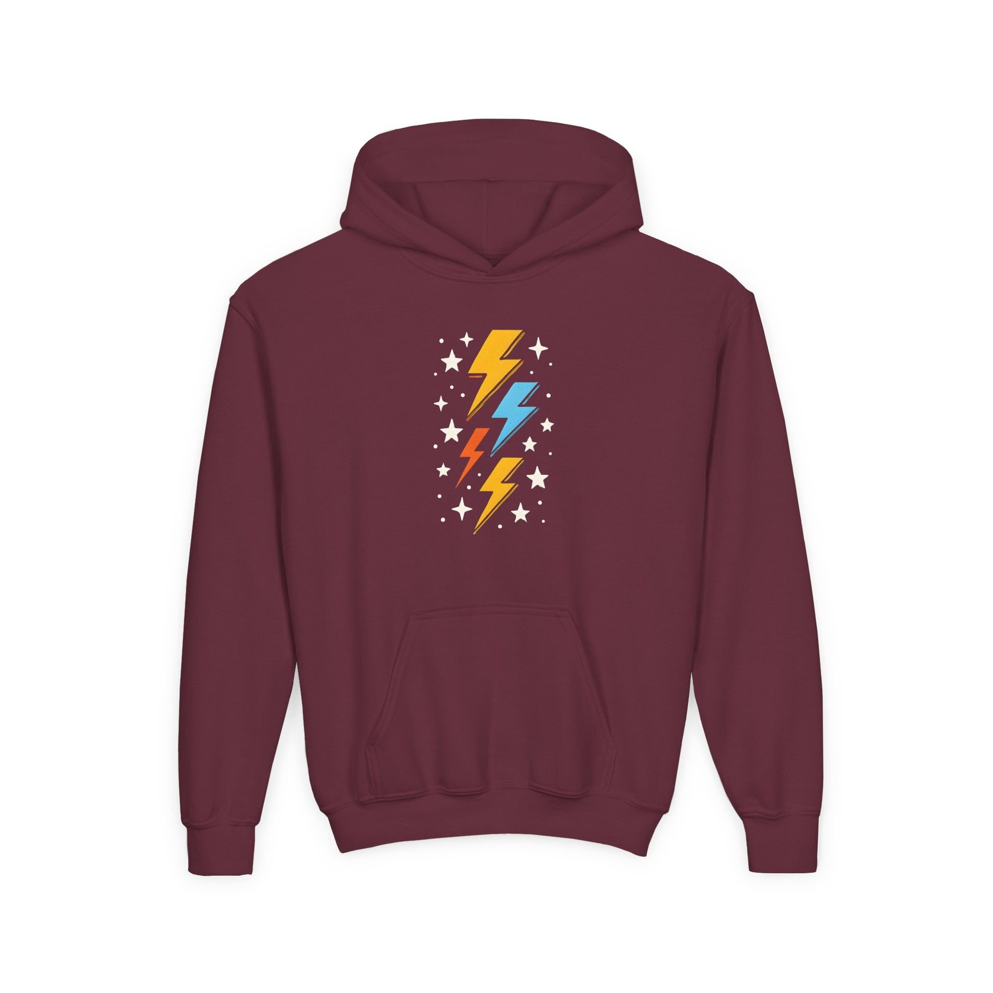 Bring a little spark to their everyday with this soft, kid-sized hoodie featuring three vibrant lightning bolts and scattered stars. The design sits centered on a cozy, medium-weight sweatshirt that keeps chilly hands tucked into a roomy kangaroo pouch. Built to move with active kids, the fabric blend holds bright prints and resists shrinking, while the sewn-in label and true-to-size fit make getting dressed simple. Wear it to school, weekend adventures, or quiet nights at home — it’s made to be lived in and loved.