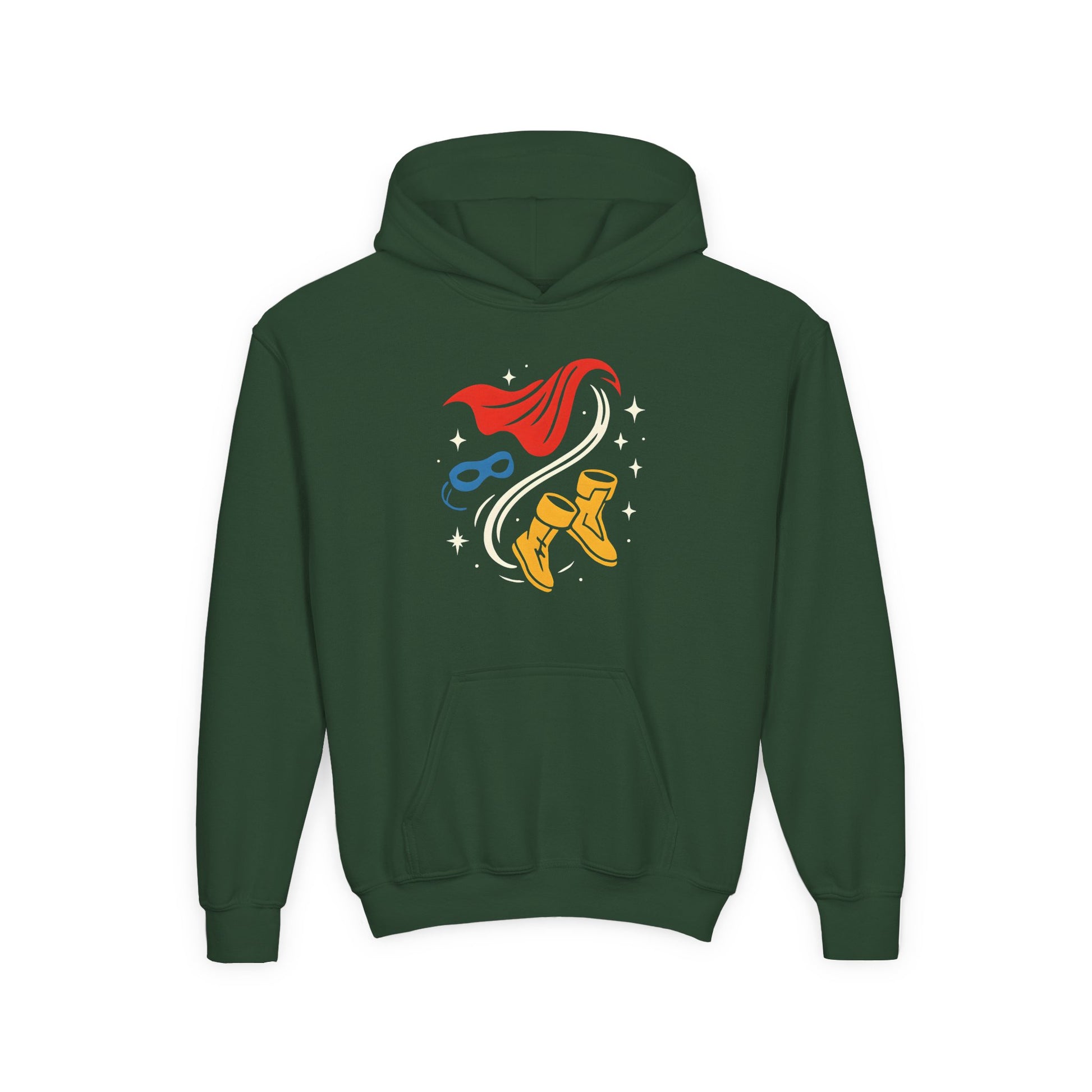 A cozy, kid-sized hoodie that brings playful imagination to chilly days. Soft yet durable midweight fabric holds bright prints and embroidered details while a roomy kangaroo pocket keeps little hands warm. The design — a flowing red cape, playful mask, and golden boots surrounded by twinkling stars — feels adventurous and magical, the kind of thing kids reach for when they want to pretend, explore, or simply be comfortable at school, practice, or a weekend outing. Comfortable neck tape and a sewn-in label reduce irritation, and the construction meets safety and compliance standards parents care about. Runs true to size and holds up to repeated wear and washes, so this hoodie becomes a dependable layer through the seasons.
