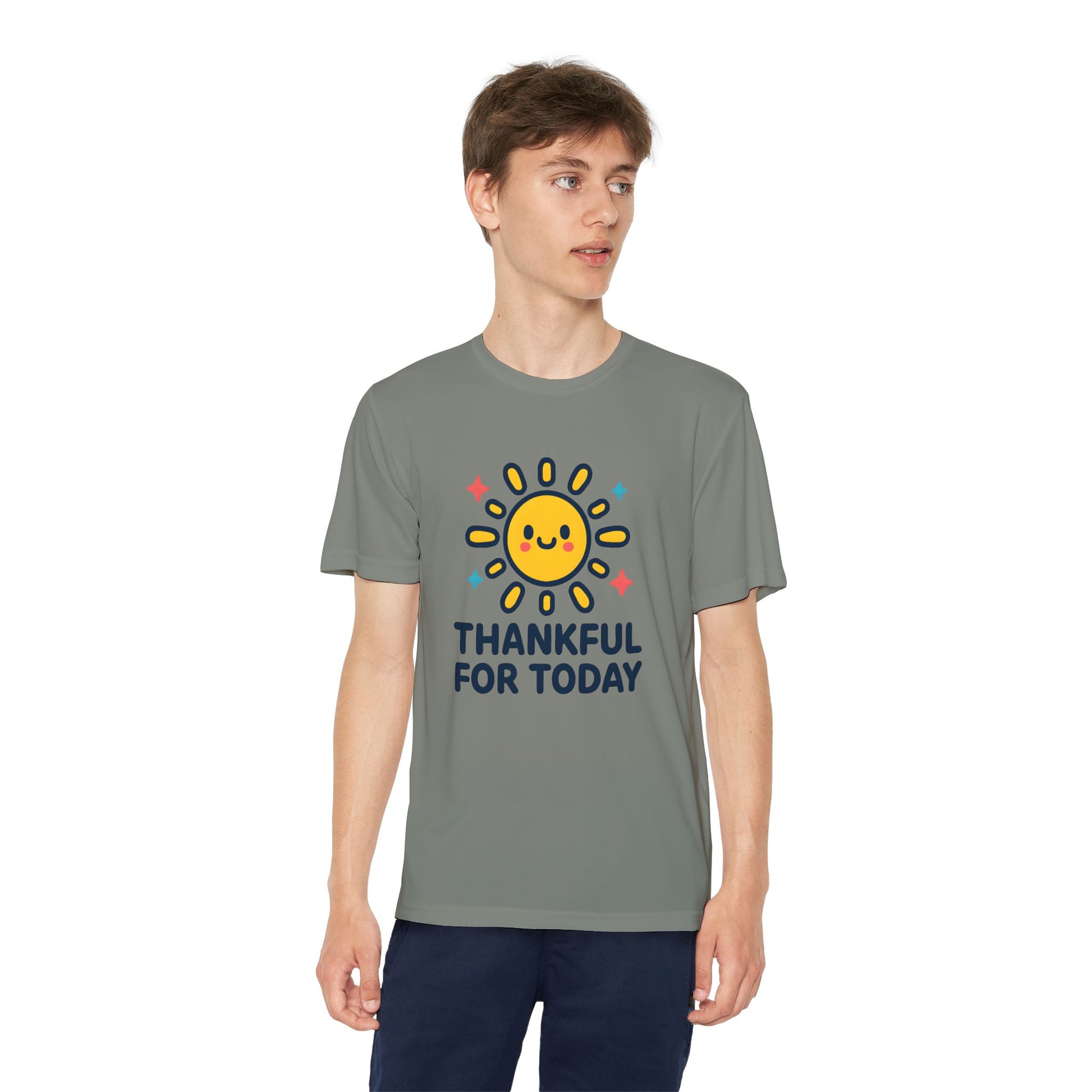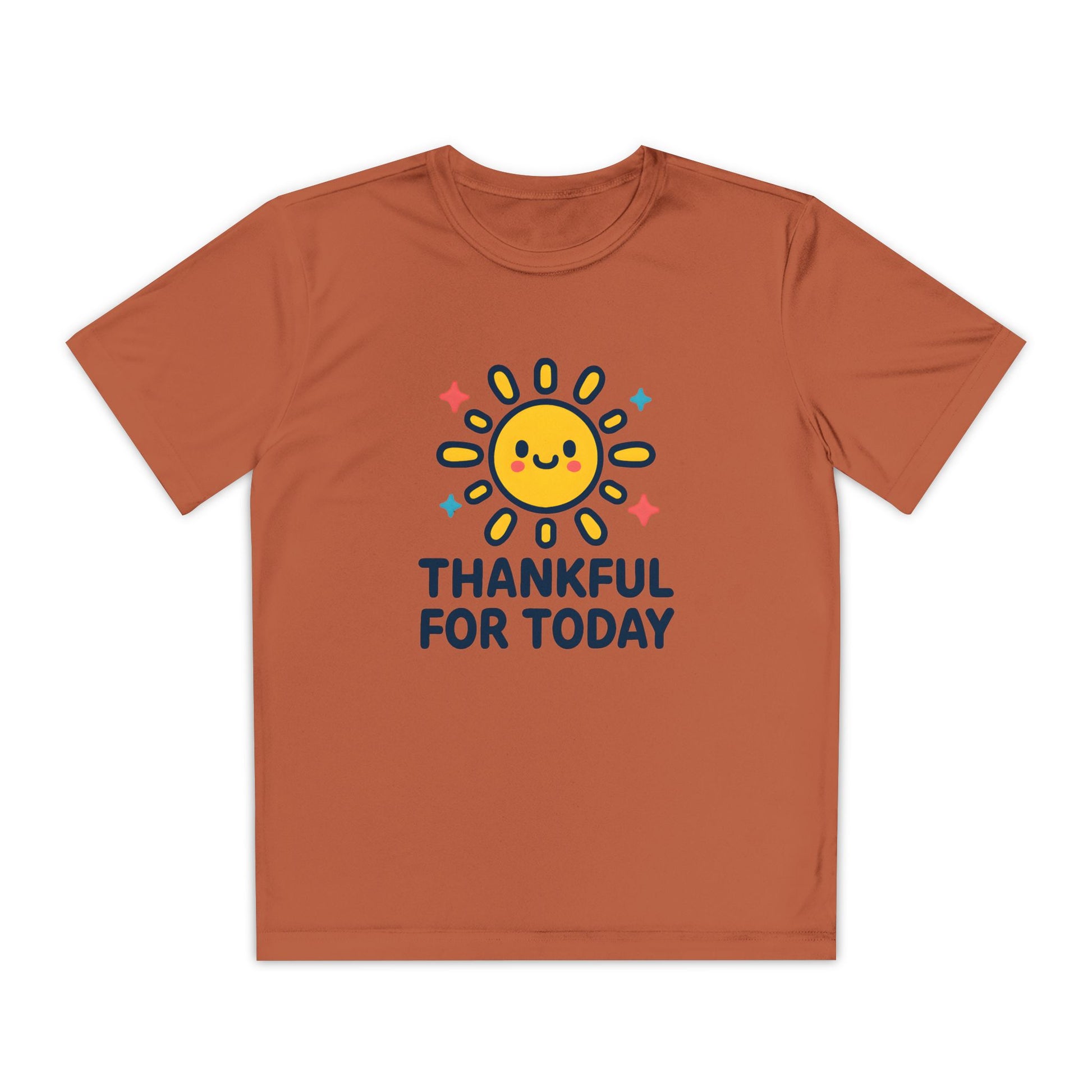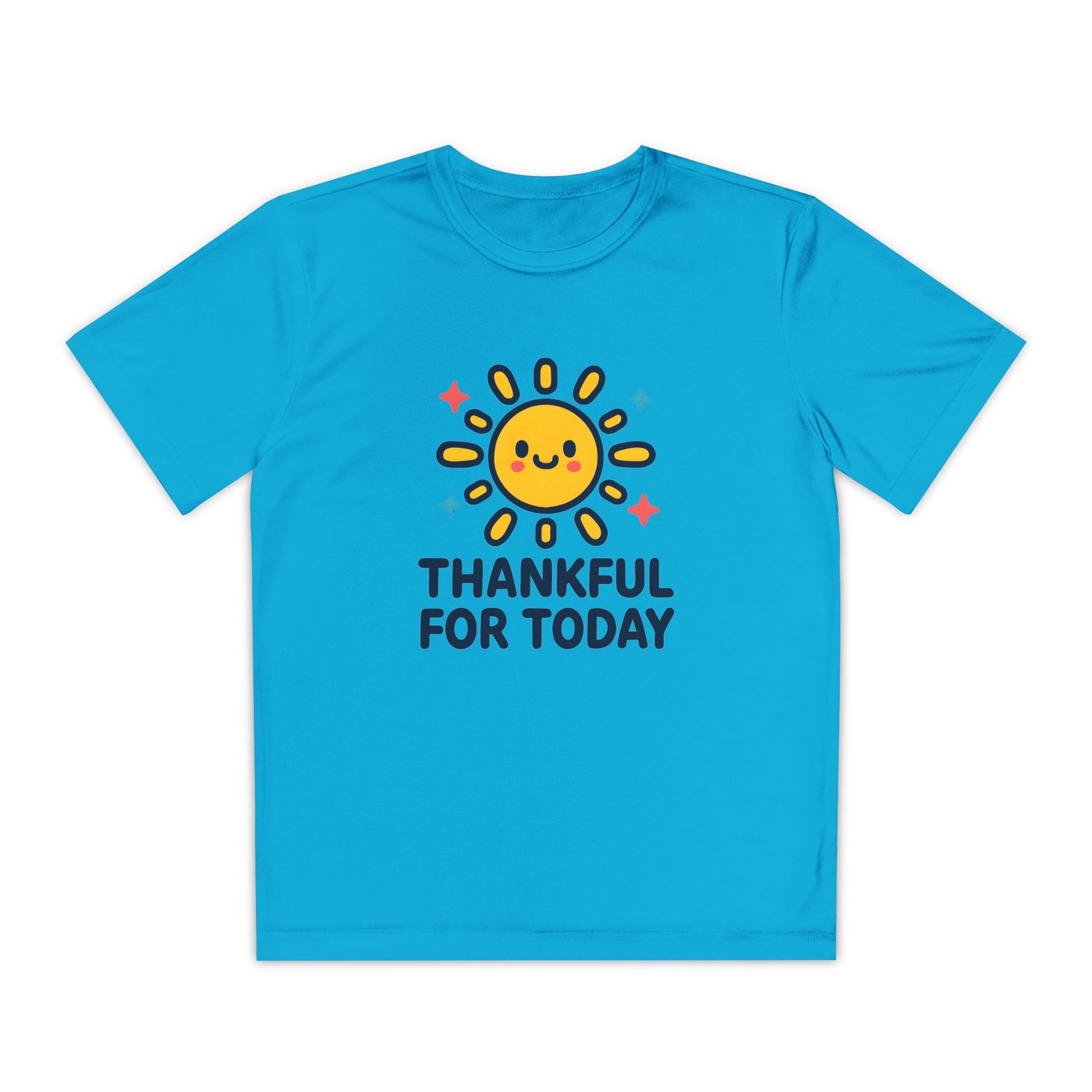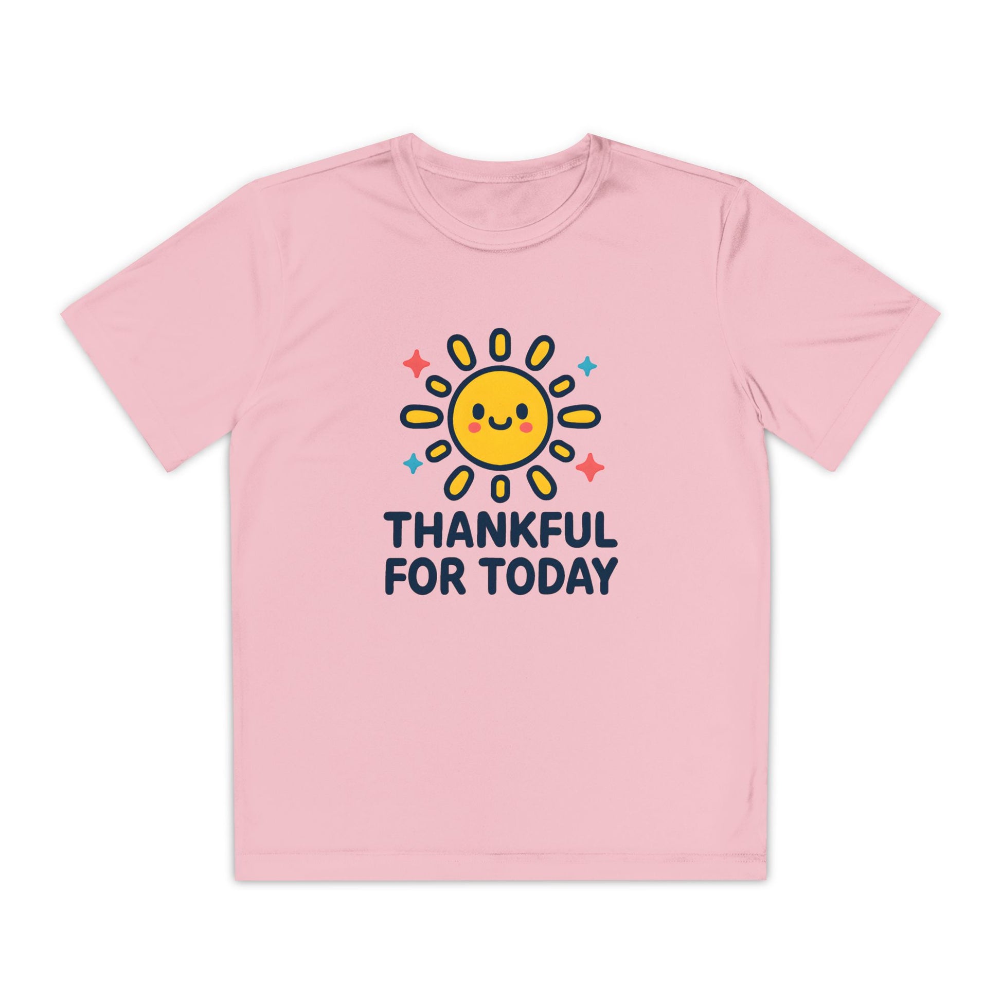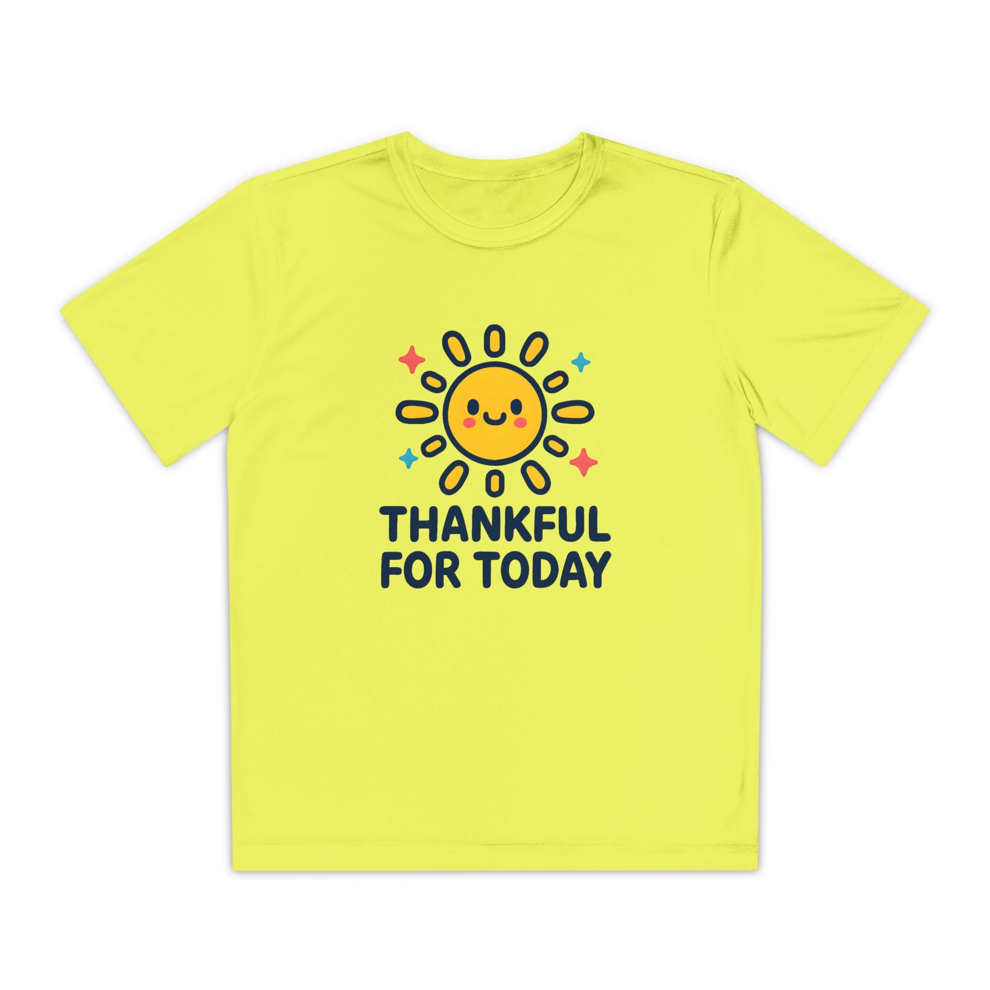 Bright, lightweight athletic tee designed for active kids who move from practice to play without missing a beat. The cheerful sun illustration and “Thankful for Today” message bring a gentle, positive vibe to every morning — whether it’s warming up on the field, heading out for a nature walk, or grabbing a snack after school. Built from breathable, quick-dry polyester with an athletic cut, this shirt stays snug through sprints and stretches, and the tear-away label keeps comfort fuss-free. The playful graphic blends durability with softness so this tee looks fresh wash after wash and becomes a go-to layer for everyday adventures.