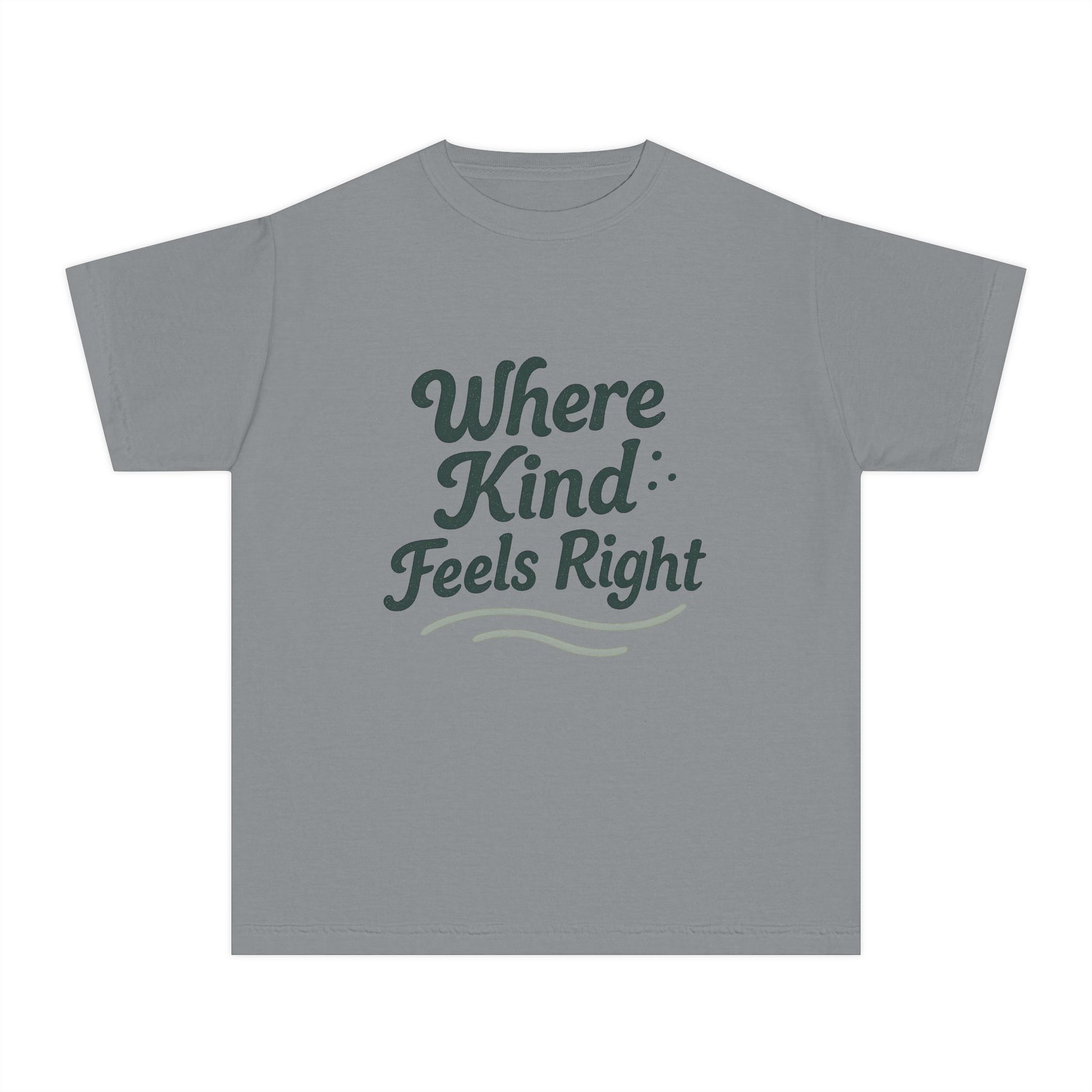 Soft and welcoming, this design features "Where Kind Feels Right" in a calm, friendly layout. This is a kids' relaxed fit t-shirt designed for easy everyday wear. The message feels gentle and inclusive.